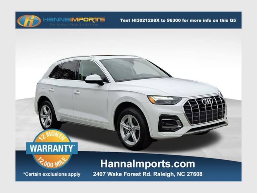 Why shop with Hanna Imports? We specialize in hand-selecting top-quality used cars, trucks, and SUVs for drivers across Raleigh, Durham, Cary, Chapel Hill, and the greater Triangle area of North Carolina. Our massive selection of 1,000+ vehicles on our Raleigh lot is carefully curated to include the most sought-after models, all priced below market value. We believe in transparency and efficiencyâ"our vehicles are aggressively priced from the start, which means no haggling, no hassle, and no wasted time. The price you see is our absolute best price. Whether you're coming from Wake Forest, Apex, Garner, or anywhere in central NC, weâre committed to making your car-buying experience smooth, affordable, and enjoyable. Come see why Hanna Imports is one of the most trusted used car dealerships in North Carolina! Used Audi Q5 in Raleigh. Used Audi Q5 in North Carolina, Convenience Package (Audi Advanced Key, Auto-Dimming Power Folding Exterior Mirrors, Driver Seat Memory, Heated Steering Wheel, and SiriusXM All Access Service), Q5 45 Premium quattro, Black Leather, Exterior Parking Camera Rear, Heated front seats, Panoramic Sunroof, Power Liftgate, 10 Speakers, 4-Wheel Disc Brakes, 5.302 Axle Ratio, ABS brakes, Air Conditioning, All-Weather Floor Mats, Alloy wheels, AM/FM radio, Audi Beam-Rings, Audi Guard Protection Kit, Auto High-beam Headlights, Auto-dimming Rear-View mirror, Automatic temperature control, Black Privacy Trunk Cover, Brake assist, Bumpers: body-color, Cargo Mat, Compass, Delay-off headlights, Driver door bin, Driver vanity mirror, Dual front impact airbags, Dual front side impact airbags, Electronic Stability Control, Emergency communication system: Audi connect CARE, Four wheel independent suspension, Front anti-roll bar, Front Bucket Seats, Front Center Armrest, Front dual zone A/C, Front fog lights, Front reading lights, Garage door transmitter: HomeLink, Genuine wood console insert, Genuine wood dashboard insert, Genuine wood door panel insert, Gray-Brown Birch Natural Wood Inlays, Heated 8-Way Power Front Bucket Seats, Heated door mirrors, Illuminated entry, Leather Seating Surfaces, Leather Shift Knob, Low tire pressure warning, Occupant sensing airbag, Outside temperature display, Overhead airbag, Overhead console, Panic alarm, Passenger door bin, Passenger vanity mirror, Power door mirrors, Power driver seat, Power passenger seat, Power steering, Power windows, Radio data system, Radio: Audi Sound System, Rain sensing wipers, Rear air conditioning, Rear anti-roll bar, Rear fog lights, Rear reading lights, Rear seat center armrest, Rear window defroster, Rear window wiper, Remote keyless entry, Roof rack, Security system, Speed control, Speed-sensing steering, Speed-Sensitive Wipers, Split folding rear seat, Spoiler, Steering wheel mounted audio controls, Tachometer, Telescoping steering wheel, Tilt steering wheel, Traction control, Trip computer, Turn signal indicator mirrors, Variably intermittent wipers, and Wheels: 18" 5-Arm-Star Design.
