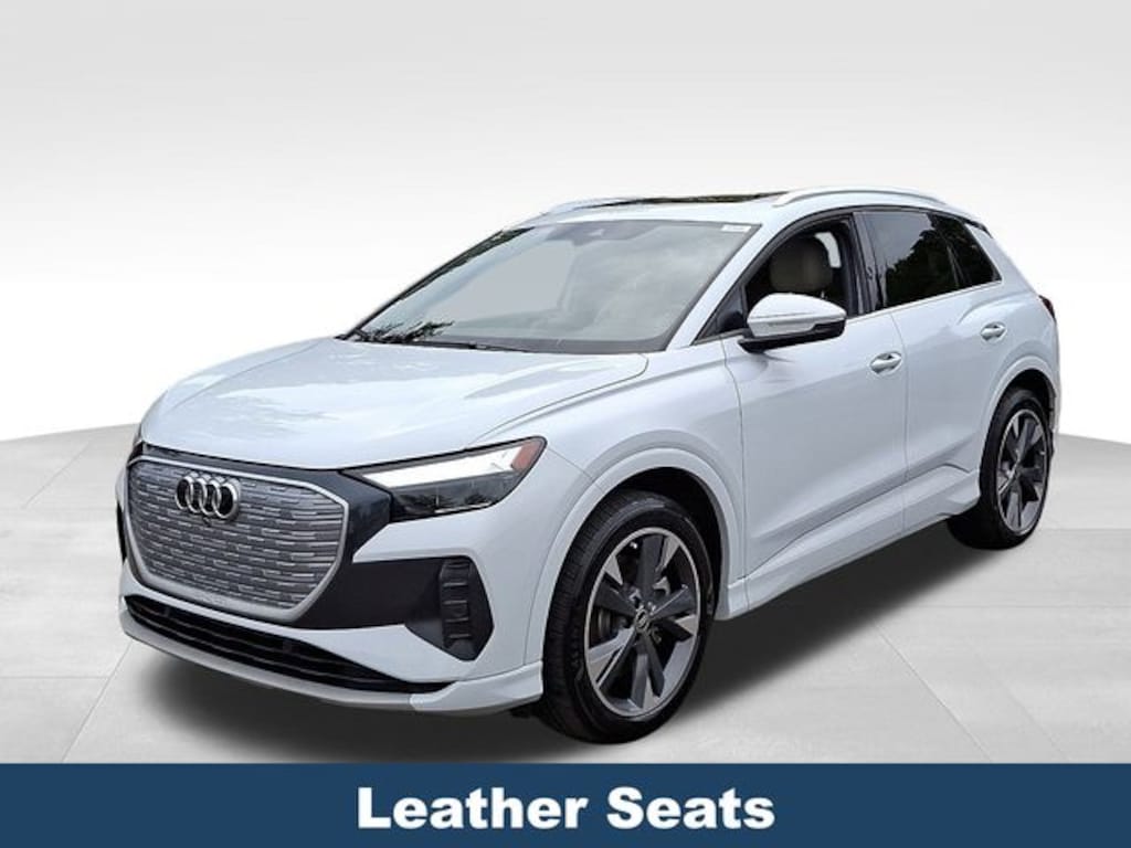 Why shop with Hanna Imports? We specialize in hand-selecting top-quality used cars, trucks, and SUVs for drivers across Raleigh, Durham, Cary, Chapel Hill, and the greater Triangle area of North Carolina. Our massive selection of 1,000+ vehicles on our Raleigh lot is carefully curated to include the most sought-after models, all priced below market value. We believe in transparency and efficiencyâ"our vehicles are aggressively priced from the start, which means no haggling, no hassle, and no wasted time. The price you see is our absolute best price. Whether you're coming from Wake Forest, Apex, Garner, or anywhere in central NC, weâre committed to making your car-buying experience smooth, affordable, and enjoyable. Come see why Hanna Imports is one of the most trusted used car dealerships in North Carolina! Used Audi Q4 e-tron in Raleigh. Used Audi Q4 e-tron in North Carolina, Convenience Package (Alarm System w/Motion Sensor, Audi Advanced Key, Auto-Dimming Interior Mirror w/Compass, Auto-Dimming Power Folding Exterior Mirrors, Dual Pane Acoustic Glass for Front Side Windows, Power Front Passenger Seat, Power Tailgate, Projection Light in Exterior Mirrors, SiriusXM w/360L, and Wireless Phone Charging Pad), LED Interior Lighting Plus Package, Premium Plus (Adaptive Cruise Assist w/Lane Guidance and Heated Steering Wheel), Q4 e-tron Premium Plus quattro, Electric Motor, Glacier White, 8 Speakers, Exterior Parking Camera Rear, Heated Front Seats, Power moonroof: Panoramic, ABS brakes, Air Conditioning, Alloy wheels, Audi Beam-Rings, Audi Guard Protection Kit, Auto High-beam Headlights, Automatic temperature control, Brake assist, Bumpers: body-color, Delay-off headlights, Driver door bin, Driver vanity mirror, Dual front impact airbags, Dual front side impact airbags, Electronic Stability Control, Emergency communication system: Audi connect CARE, Four wheel independent suspension, Front anti-roll bar, Front Bucket Seats, Front Center Armrest, Front dual zone A/C, Front reading lights, Fully automatic headlights, Genuine wood dashboard insert, Heated door mirrors, Heated front seats, Illuminated entry, Leather Seating Surfaces, Leather steering wheel, Low tire pressure warning, Occupant sensing airbag, Outside temperature display, Overhead airbag, Overhead console, Panic alarm, Passenger door bin, Passenger vanity mirror, Power door mirrors, Power driver seat, Power steering, Power windows, Radio data system, Radio: Audi Sound System, Rain sensing wipers, Rear air conditioning, Rear anti-roll bar, Rear reading lights, Rear seat center armrest, Rear window defroster, Rear window wiper, Remote keyless entry, Roof rack: rails only, Security system, Speed control, Speed-sensing steering, Split folding rear seat, Spoiler, Steering wheel mounted audio controls, TBD Axle Ratio, Telescoping steering wheel, Tilt steering wheel, Traction control, Trip computer, Turn signal indicator mirrors, Variably intermittent wipers, Wheels: 19" 5-Arm Design, and Wheels: 20" 5-Y-Spoke Design.