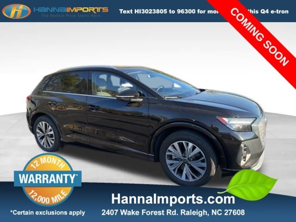 Why shop with Hanna Imports? We specialize in hand-selecting top-quality used cars, trucks, and SUVs for drivers across Raleigh, Durham, Cary, Chapel Hill, and the greater Triangle area of North Carolina. Our massive selection of 1,000+ vehicles on our Raleigh lot is carefully curated to include the most sought-after models, all priced below market value. We believe in transparency and efficiencyâ"our vehicles are aggressively priced from the start, which means no haggling, no hassle, and no wasted time. The price you see is our absolute best price. Whether you're coming from Wake Forest, Apex, Garner, or anywhere in central NC, weâre committed to making your car-buying experience smooth, affordable, and enjoyable. Come see why Hanna Imports is one of the most trusted used car dealerships in North Carolina! Used Audi Q4 e-tron in Raleigh. Used Audi Q4 e-tron in North Carolina, Convenience Package, LED Interior Lighting Plus Package, Premium Plus (Adaptive Cruise Assist w/Lane Guidance, Audi Connect PLUS, Audi MMI Navigation Plus, Audi Virtual Cockpit Plus, Heated Steering Wheel, Park Assist Plus, SONOS Premium Sound System, and Traffic Sign Recognition), Q4 e-tron Premium Plus, Exterior Parking Camera Rear, Power Liftgate, Power moonroof: Panoramic, Remote keyless entry, 8 Speakers, ABS brakes, Air Conditioning, Alloy wheels, Auto High-beam Headlights, Automatic temperature control, Brake assist, Bumpers: body-color, Delay-off headlights, Driver door bin, Driver vanity mirror, Dual front impact airbags, Dual front side impact airbags, Electronic Stability Control, Emergency communication system: Audi connect CARE, Four wheel independent suspension, Front anti-roll bar, Front Bucket Seats, Front Center Armrest, Front dual zone A/C, Front reading lights, Fully automatic headlights, Genuine wood dashboard insert, Heated door mirrors, Heated Front Seats, Heated front seats, Illuminated entry, Leather Seating Surfaces, Leather steering wheel, Low tire pressure warning, Occupant sensing airbag, Outside temperature display, Overhead airbag, Overhead console, Panic alarm, Passenger door bin, Passenger vanity mirror, Power door mirrors, Power driver seat, Power steering, Power windows, Radio data system, Radio: Audi Sound System, Rain sensing wipers, Rear air conditioning, Rear anti-roll bar, Rear reading lights, Rear seat center armrest, Rear window defroster, Rear window wiper, Security system, Speed control, Speed-sensing steering, Split folding rear seat, Spoiler, Steering wheel mounted audio controls, TBD Axle Ratio, Telescoping steering wheel, Tilt steering wheel, Traction control, Trip computer, Turn signal indicator mirrors, Variably intermittent wipers, and Wheels: 19" 5-W-Spoke Aero Design.