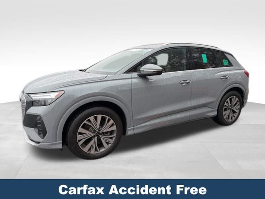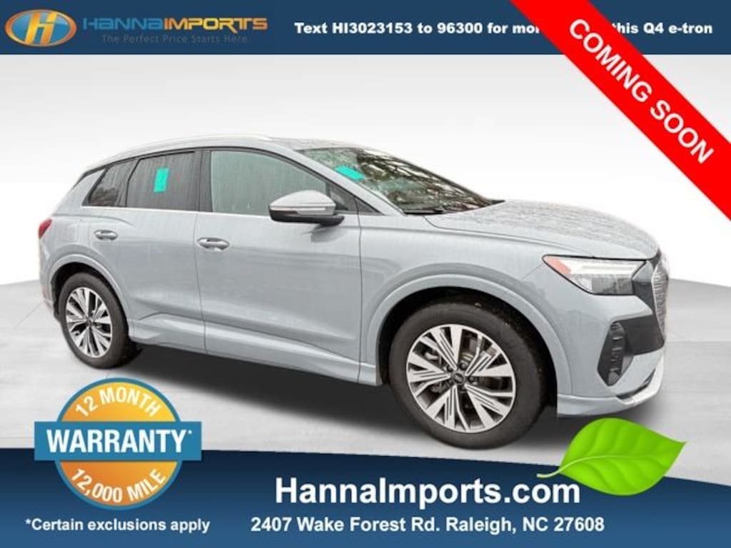 Why shop with Hanna Imports? We specialize in hand-selecting top-quality used cars, trucks, and SUVs for drivers across Raleigh, Durham, Cary, Chapel Hill, and the greater Triangle area of North Carolina. Our massive selection of 1,000+ vehicles on our Raleigh lot is carefully curated to include the most sought-after models, all priced below market value. We believe in transparency and efficiencyâ"our vehicles are aggressively priced from the start, which means no haggling, no hassle, and no wasted time. The price you see is our absolute best price. Whether you're coming from Wake Forest, Apex, Garner, or anywhere in central NC, weâre committed to making your car-buying experience smooth, affordable, and enjoyable. Come see why Hanna Imports is one of the most trusted used car dealerships in North Carolina! Used Audi Q4 e-tron in Raleigh. Used Audi Q4 e-tron in North Carolina, Convenience Package (Alarm System w/Motion Sensor, Audi Advanced Key, Auto-Dimming Power Folding Exterior Mirrors, Auto-Dimming Rear-View Mirror, Dual-Pane Acoustic Glass for Front Side Windows, Garage Door Opener, Hands-Free Power Tailgate, Memory for Driver's Seat, Power Front Passenger Seat, Projection Light in Exterior Mirrors, SiriusXM w/360L, and Wireless Phone Charging Pad), Q4 e-tron Premium, Exterior Parking Camera Rear, Navigation system: MMI Navigation plus, Power Liftgate, Power moonroof: Panoramic, 8 Speakers, ABS brakes, Air Conditioning, Alloy wheels, Auto High-beam Headlights, Automatic temperature control, Brake assist, Bumpers: body-color, Delay-off headlights, Driver door bin, Driver vanity mirror, Dual front impact airbags, Dual front side impact airbags, Electronic Stability Control, Emergency communication system: Audi connect CARE (limited time subscription - acceptance of terms required), Four wheel independent suspension, Front anti-roll bar, Front Bucket Seats, Front Center Armrest, Front dual zone A/C, Front reading lights, Fully automatic headlights, Genuine wood dashboard insert, Heated door mirrors, Heated Front Seats, Heated front seats, Illuminated entry, Leather Seating Surfaces, Leather steering wheel, Low tire pressure warning, Occupant sensing airbag, Outside temperature display, Overhead airbag, Overhead console, Panic alarm, Passenger door bin, Passenger vanity mirror, Power door mirrors, Power driver seat, Power steering, Power windows, Radio data system, Radio: Audi Sound System, Rain sensing wipers, Rear air conditioning, Rear anti-roll bar, Rear reading lights, Rear seat center armrest, Rear window defroster, Rear window wiper, Remote keyless entry, Security system, Speed control, Speed-sensing steering, Split folding rear seat, Spoiler, Steering wheel mounted audio controls, Telescoping steering wheel, Tilt steering wheel, Traction control, Trip computer, Turn signal indicator mirrors, Variably intermittent wipers, and Wheels: 19" 5-W-Spoke Aero Design.