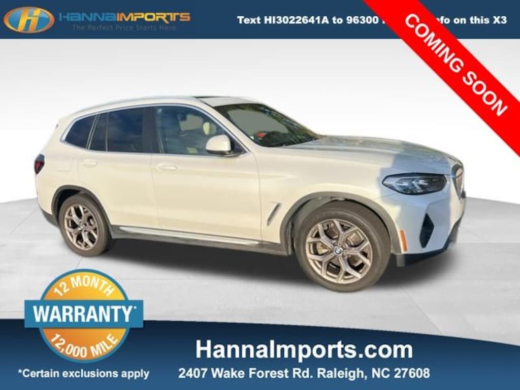 Why shop with Hanna Imports? We specialize in hand-selecting top-quality used cars, trucks, and SUVs for drivers across Raleigh, Durham, Cary, Chapel Hill, and the greater Triangle area of North Carolina. Our massive selection of 1,000+ vehicles on our Raleigh lot is carefully curated to include the most sought-after models, all priced below market value. We believe in transparency and efficiencyâ"our vehicles are aggressively priced from the start, which means no haggling, no hassle, and no wasted time. The price you see is our absolute best price. Whether you're coming from Wake Forest, Apex, Garner, or anywhere in central NC, weâre committed to making your car-buying experience smooth, affordable, and enjoyable. Come see why Hanna Imports is one of the most trusted used car dealerships in North Carolina! Used BMW X3 in Raleigh. Used BMW X3 in North Carolina, Connected Package Pro, Convenience Package (Lumbar Support and Panoramic Moonroof), 8-Speed Automatic Sport, Canberra Beige Canberra Beige Perforated Sens, AM/FM radio: SiriusXM with 360L, Apple CarPlay & Android Auto Compatibility, Enhanced Bluetooth, Exterior Parking Camera Rear, Fine Wood Open-Pored Ash Grain Trim, Front Bucket Seats, Heated Front Seats, Heated Steering Wheel, Hi-Fi Sound System, Perforated SensaTec Upholstery, Power Front Seats, Power Liftgate, Roof rack: rails only, Sport Seats, Sport steering wheel, WiFi Hotspot, 12 Speakers, 3.385 Axle Ratio, 4-Wheel Disc Brakes, ABS brakes, Air Conditioning, Alloy wheels, AM/FM Radio, Auto High-beam Headlights, Auto-dimming door mirrors, Auto-dimming Rear-View mirror, Automatic temperature control, BMW Assist eCall, BMW TeleServices, Brake assist, Bumpers: body-color, Comfort Access Keyless Entry, ConnectedDrive Services, Delay-off headlights, Driver door bin, Driver vanity mirror, Dual front impact airbags, Dual front side impact airbags, Electronic Stability Control, Emergency communication system: BMW Assist eCall, Four wheel independent suspension, Front anti-roll bar, Front Center Armrest, Front dual zone A/C, Front reading lights, Fully automatic headlights, Garage door transmitter, Genuine wood dashboard insert, Genuine wood door panel insert, Heated door mirrors, Illuminated entry, Knee airbag, Low tire pressure warning, Memory seat, Navigation, Navigation System, Occupant sensing airbag, Outside temperature display, Overhead airbag, Panic alarm, Passenger door bin, Passenger vanity mirror, Power door mirrors, Power driver seat, Power passenger seat, Power steering, Power windows, Radio data system, Rain sensing wipers, Rear air conditioning, Rear anti-roll bar, Rear reading lights, Rear seat center armrest, Rear window defroster, Rear window wiper, Remote keyless entry, Security system, SiriusXM w/360L, Speed control, Speed-sensing steering, Speed-Sensitive Wipers, Split folding rear seat, Spoiler, Steering wheel mounted audio controls, Tachometer, Telescoping steering wheel, Tilt steering wheel, Traction control, Trip computer, Turn signal indicator mirrors, Variably intermittent wipers, and Wheels: 19" x 7.5" Y-Spoke (Style 693)