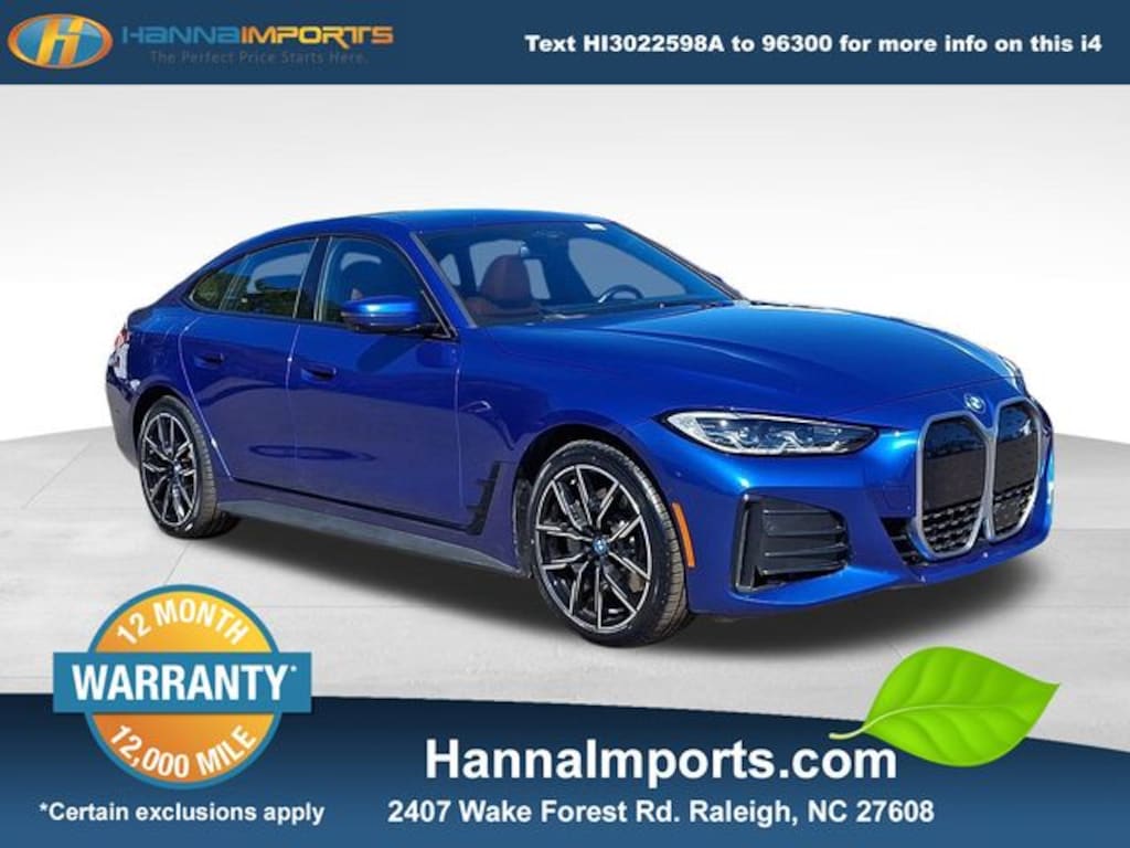 Why shop with Hanna Imports? We specialize in hand-selecting top-quality used cars, trucks, and SUVs for drivers across Raleigh, Durham, Cary, Chapel Hill, and the greater Triangle area of North Carolina. Our massive selection of 1,000+ vehicles on our Raleigh lot is carefully curated to include the most sought-after models, all priced below market value. We believe in transparency and efficiencyâ"our vehicles are aggressively priced from the start, which means no haggling, no hassle, and no wasted time. The price you see is our absolute best price. Whether you're coming from Wake Forest, Apex, Garner, or anywhere in central NC, weâre committed to making your car-buying experience smooth, affordable, and enjoyable. Come see why Hanna Imports is one of the most trusted used car dealerships in North Carolina! Used BMW i4 in Raleigh. Used BMW i4 in North Carolina, Connected Package Pro, Driving Assistance Professional Package (Active Driving Assistant Pro and Extended Traffic Jam Assistant), M Sport Package (Adaptive M Suspension, Aerodynamic Kit, M Steering Wheel, Shadowline Exterior Trim, Variable Sport Steering, Wheels: 19" x 8.5" Fr & 19" x 9.0" Rr M Y-Spoke, and Without Lines Designation Outside), M Sport Package (337), Parking Assistance Package (Active Park Distance Control, Parking Assistant Plus, Rear-View Camera, and Surround View w/3D View), Premium Package (Ambient Lighting, Heated Front Seats, Heated Steering Wheel, and Lumbar Support), i4 eDrive40, Apple CarPlay & Android Auto Compatibility, Exterior Parking Camera Rear, Navigation system: BMW Maps Navigation, Power Liftgate, Power moonroof, 10 Speakers, 4-Wheel Disc Brakes, ABS brakes, Adjustable Seat Width, Air Conditioning, Alloy wheels, Auto High-beam Headlights, Auto-dimming door mirrors, Auto-dimming Rear-View mirror, Auto-leveling suspension, Automatic temperature control, BMW Assist eCall, BMW Curved Display, BMW Curved Display w/HUD, BMW TeleServices, Brake assist, Bumpers: body-color, Compass, ConnectedDrive Services, Delay-off headlights, Driver door bin, Driver vanity mirror, Dual front impact airbags, Dual front side impact airbags, Electronic Stability Control, Emergency communication system: BMW Assist eCall, Four wheel independent suspension, Front anti-roll bar, Front Bucket Seats, Front Center Armrest, Front dual zone A/C, Front reading lights, Fully automatic headlights, Garage door transmitter, Heated door mirrors, Hi-Fi Sound System, Iconic Sounds Electric, Illuminated entry, Leather Shift Knob, Leather steering wheel, Low tire pressure warning, Memory seat, Occupant sensing airbag, Outside temperature display, Overhead airbag, Overhead console, Panic alarm, Passenger door bin, Passenger vanity mirror, Perforated Sensatec Upholstery, Power door mirrors, Power driver seat, Power Front Seats, Power passenger seat, Power steering, Power windows, Radio data system, Radio: FM Audio System, Rain sensing wipers, Rear air conditioning, Rear anti-roll bar, Rear reading lights, Rear seat center armrest, Rear window defroster, Remote keyless entry, Security system, SiriusXM w/360L, Speed control, Speed-sensing