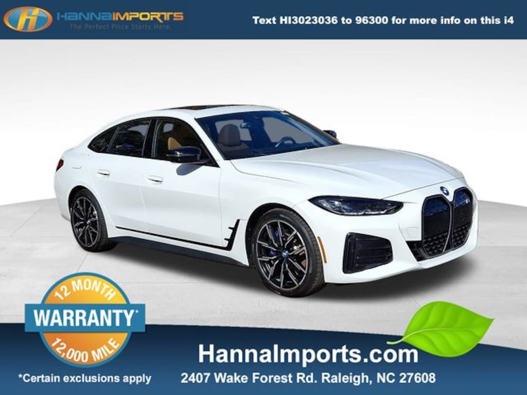 Why shop with Hanna Imports? We specialize in hand-selecting top-quality used cars, trucks, and SUVs for drivers across Raleigh, Durham, Cary, Chapel Hill, and the greater Triangle area of North Carolina. Our massive selection of 1,000+ vehicles on our Raleigh lot is carefully curated to include the most sought-after models, all priced below market value. We believe in transparency and efficiencyâ"our vehicles are aggressively priced from the start, which means no haggling, no hassle, and no wasted time. The price you see is our absolute best price. Whether you're coming from Wake Forest, Apex, Garner, or anywhere in central NC, weâre committed to making your car-buying experience smooth, affordable, and enjoyable. Come see why Hanna Imports is one of the most trusted used car dealerships in North Carolina! Used BMW i4 in Raleigh. Used BMW i4 in North Carolina, Connected Package Pro, M Sport Package (Adaptive M Suspension, Aerodynamic Kit, M Steering Wheel, Shadowline Exterior Trim, Variable Sport Steering, Wheels: 19" x 8.5" Fr & 19" x 9.0" Rr M Y-Spoke, and Without Lines Designation Outside), M Sport Package (337), M Sport Package Pro, Premium Package (Ambient Lighting, Driver Lumbar Support, Heated Front Seats, Heated Steering Wheel, and Iconic Sounds Electric), Shadowline Package (Black Mirror Caps, Extended Shadowline Trim, M Shadowline Lights, and M Sport Brakes w/Red Calipers), i4 eDrive40, Exterior Parking Camera Rear, Navigation system: BMW Maps Navigation, Power Liftgate, Power moonroof, 10 Speakers, 4-Wheel Disc Brakes, ABS brakes, Air Conditioning, Alloy wheels, Apple CarPlay & Android Auto Compatibility, Auto High-beam Headlights, Auto-dimming door mirrors, Auto-dimming Rear-View mirror, Auto-leveling suspension, Automatic temperature control, BMW Assist eCall, BMW Curved Display, BMW TeleServices, Brake assist, Bumpers: body-color, Compass, ConnectedDrive Services, Delay-off headlights, Driver door bin, Driver vanity mirror, Dual front impact airbags, Dual front side impact airbags, Electronic Stability Control, Emergency communication system: BMW Assist eCall, Four wheel independent suspension, Front anti-roll bar, Front Bucket Seats, Front Center Armrest, Front dual zone A/C, Front reading lights, Fully automatic headlights, Garage door transmitter, Heated door mirrors, Hi-Fi Sound System, Illuminated entry, Leather steering wheel, Low tire pressure warning, M Sport Brakes w/Blue Calipers, Memory seat, Occupant sensing airbag, Outside temperature display, Overhead airbag, Overhead console, Panic alarm, Passenger door bin, Passenger vanity mirror, Perforated Sensatec Upholstery, Power door mirrors, Power driver seat, Power Front Seats, Power passenger seat, Power steering, Power windows, Radio data system, Radio: FM Audio System, Rain sensing wipers, Rear air conditioning, Rear anti-roll bar, Rear reading lights, Rear seat center armrest, Rear window defroster, Remote keyless entry, Security system, Shadowline Exterior Trim (DISC), SiriusXM Satellite Radio w/1 Year Subscription, Speed control, Speed-sensing steering, Speed-Sensitive Wipers, Split folding rear seat, Sport Seats, Sport steering wheel, Steering wheel mounted audio controls, Telescoping steeri