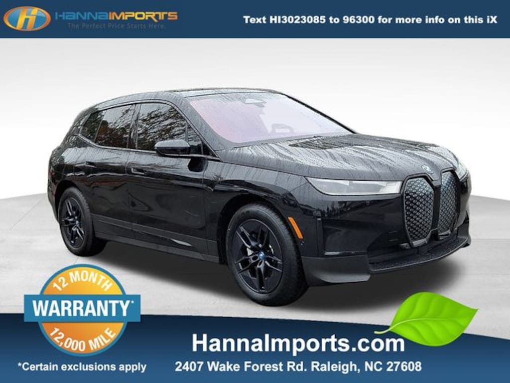 Why shop with Hanna Imports? We specialize in hand-selecting top-quality used cars, trucks, and SUVs for drivers across Raleigh, Durham, Cary, Chapel Hill, and the greater Triangle area of North Carolina. Our massive selection of 1,000+ vehicles on our Raleigh lot is carefully curated to include the most sought-after models, all priced below market value. We believe in transparency and efficiencyâ"our vehicles are aggressively priced from the start, which means no haggling, no hassle, and no wasted time. The price you see is our absolute best price. Whether you're coming from Wake Forest, Apex, Garner, or anywhere in central NC, weâre committed to making your car-buying experience smooth, affordable, and enjoyable. Come see why Hanna Imports is one of the most trusted used car dealerships in North Carolina! Used BMW iX in Raleigh. Used BMW iX in North Carolina, Connected Package Pro, iX xDrive50, Apple CarPlay & Android Auto Compatibility, Apple CarPlay Compatibility, Exterior Parking Camera Rear, Front Ventilated Seats, Heated Front Seats, Navigation System, Power Liftgate, 12 Speakers, 4-Wheel Disc Brakes, 8.77 Axle Ratio, ABS brakes, Air Conditioning, Alloy wheels, AM/FM Stereo, Auto High-beam Headlights, Auto tilt-away steering wheel, Auto-dimming door mirrors, Auto-dimming Rear-View mirror, Automatic temperature control, BMW Assist eCall, BMW TeleServices, Brake assist, Bucket Seats, Bumpers: body-color, Compass, Complimentary Public Charging Program (DISC), Connected eDrive Services, ConnectedDrive Services, Delay-off headlights, Driver door bin, Driver vanity mirror, Dual front impact airbags, Dual front side impact airbags, Electronic Stability Control, Emergency communication system: BMW Assist eCall, Four wheel independent suspension, Front anti-roll bar, Front Bucket Seats, Front Center Armrest, Front dual zone A/C, Front reading lights, Fully automatic headlights, Garage door transmitter, Heated door mirrors, Heated front seats, Hi-Fi Sound System, Illuminated entry, Leather steering wheel, Low tire pressure warning, Memory seat, Natural Interaction, Navigation, Occupant sensing airbag, Outside temperature display, Overhead airbag, Panic alarm, Passenger door bin, Passenger vanity mirror, Perforated SensaTec Upholstery, Power door mirrors, Power driver seat, Power passenger seat, Power steering, Power windows, Radio data system, Rain sensing wipers, Rear air conditioning, Rear anti-roll bar, Rear dual zone A/C, Rear reading lights, Rear seat center armrest, Rear window defroster, Rear window wiper, Remote keyless entry, Security system, SiriusXM w/360L & 1 Yr Platinum Plan Subscription, Speed control, Speed-sensing steering, Speed-Sensitive Wipers, Split folding rear seat, Spoiler, Sport steering wheel, Steering wheel memory, Steering wheel mounted audio controls, Telescoping steering wheel, Tilt steering wheel, Traction control, Trip computer, Turn signal indicator mirrors, Variably intermittent wipers, Wheels: 20" x 8.5" Aero Frzn Drk Grey (Style 1002) (1GR), and Wireless Device Charging.