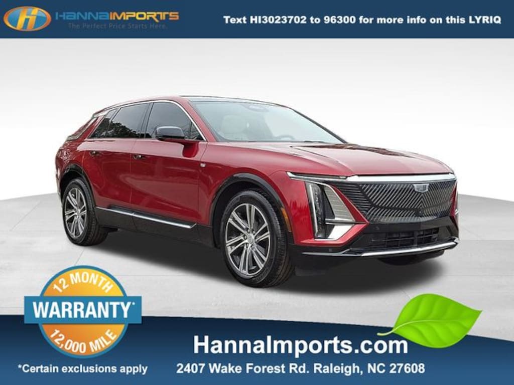 Why shop with Hanna Imports? We specialize in hand-selecting top-quality used cars, trucks, and SUVs for drivers across Raleigh, Durham, Cary, Chapel Hill, and the greater Triangle area of North Carolina. Our massive selection of 1,000+ vehicles on our Raleigh lot is carefully curated to include the most sought-after models, all priced below market value. We believe in transparency and efficiencyâ"our vehicles are aggressively priced from the start, which means no haggling, no hassle, and no wasted time. The price you see is our absolute best price. Whether you're coming from Wake Forest, Apex, Garner, or anywhere in central NC, weâre committed to making your car-buying experience smooth, affordable, and enjoyable. Come see why Hanna Imports is one of the most trusted used car dealerships in North Carolina! Used Cadillac LYRIQ in Raleigh. Used Cadillac LYRIQ in North Carolina, Driver Assist Package (Enhanced Automatic Parking Assist, HD Surround Vision, Intersection Automatic Emergency Braking, Power-Folding Outside Heated Mirrors, Rear Pedestrian Alert, and Side Bicyclist Alert), LYRIQ Luxury, AWD, Power Liftgate, Wheels: 20" Split 6-Spoke Alloy, 11.63 Axle Ratio, 4-Wheel Disc Brakes, 8-Way Power Driver Seat Adjuster, ABS brakes, Air Conditioning, Alloy wheels, AM/FM radio: SiriusXM with 360L, Apple CarPlay/Android Auto, Auto High-beam Headlights, Auto-dimming door mirrors, Auto-dimming Rear-View mirror, Automatic temperature control, Battery Pack Origin, Brake assist, Bumpers: body-color, Compass, Delay-off headlights, Driver & Front Passenger Heated Seats, Driver 4-Way Power Lumbar Seat Adjustment, Driver door bin, Driver vanity mirror, Dual front impact airbags, Dual front side impact airbags, Electronic Stability Control, Emergency communication system: OnStar and Cadillac connected services capable, Four wheel independent suspension, Front & Rear All-Weather Floor Mats, Front anti-roll bar, Front Bucket Seats, Front Center Armrest, Front dual zone A/C, Front License Plate Bracket, Front Passenger 4-Way Power Lumbar Seat Adjustment, Front reading lights, Fully automatic headlights, Garage door transmitter, Heated door mirrors, Heated front seats, Heated steering wheel, Hitch Guidance w/Trailering Assist Guideline, Hitch View, Illuminated entry, Inteluxe Seat Trim, Knee airbag, Leather steering wheel, Low tire pressure warning, Memory seat, Navigation system: Google Automotive Services Capable, Occupant sensing airbag, Outside temperature display, Overhead airbag, Overhead console, Panic alarm, Passenger door bin, Passenger vanity mirror, Power door mirrors, Power driver seat, Power passenger seat, Power steering, Power windows, Premium Suspension, Radio data system, Radio: Google Built-In Infotainment Experience, Rain sensing wipers, Rear anti-roll bar, Rear reading lights, Rear seat center armrest, Rear window defroster, Remote keyless entry, Security system, SiriusXM w/360L, Speed control, Speed-sensing steering, Split folding rear seat, Spoiler, Steering wheel memory, Steering wheel mounted audio controls, Telescoping steering wheel, Tilt steering wheel, Traction control, Trip computer, Turn signal indicator mirrors, and Variably intermittent wipers.