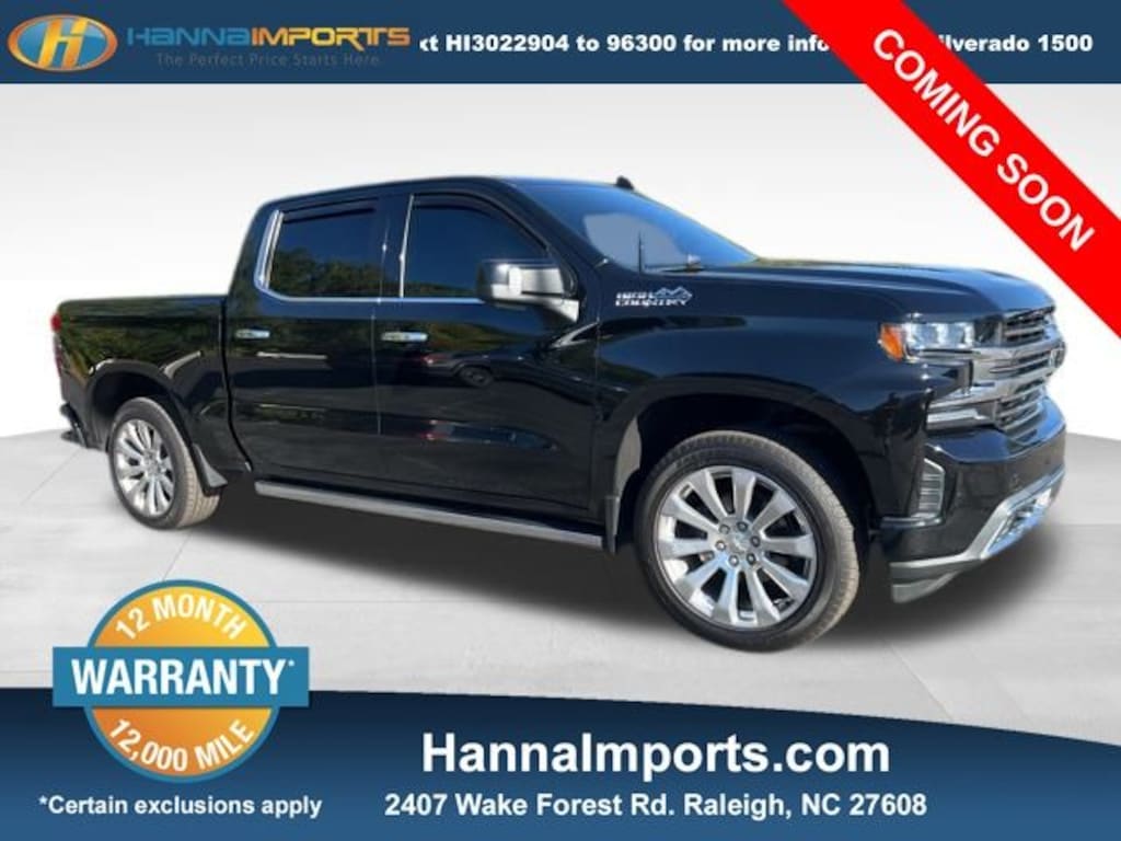 Why shop with Hanna Imports? We specialize in hand-selecting top-quality used cars, trucks, and SUVs for drivers across Raleigh, Durham, Cary, Chapel Hill, and the greater Triangle area of North Carolina. Our massive selection of 1,000+ vehicles on our Raleigh lot is carefully curated to include the most sought-after models, all priced below market value. We believe in transparency and efficiencyâ"our vehicles are aggressively priced from the start, which means no haggling, no hassle, and no wasted time. The price you see is our absolute best price. Whether you're coming from Wake Forest, Apex, Garner, or anywhere in central NC, weâre committed to making your car-buying experience smooth, affordable, and enjoyable. Come see why Hanna Imports is one of the most trusted used car dealerships in North Carolina! Used Chevrolet Silverado 1500 in Raleigh. Used Chevrolet Silverado 1500 in North Carolina, High Country Deluxe (All-Weather Floor Liner (LPO) and Power Sunroof), Preferred Equipment Group 3LZ (10-Way Power Driver Seat w/Lumbar, 10-Way Power Passenger Seat Adjuster w/Lumbar, 12-Volt Rear Auxiliary Power Outlet, 120-Volt Bed Mounted Power Outlet, 120-Volt Instrument Panel Power Outlet, 2nd Row Heated Outboard Seats, 8" Driver Information Center, Advanced Trailering System, Auto-Dimming Inside Rear-View Mirror, Auxiliary External Transmission Oil Cooler, Bluetooth® For Phone, Chevytec Spray-On Black Bedliner, Chrome Assist Steps, Chrome Grille, Chrome Recovery Hooks, Color-Keyed Carpeting Floor Covering, Compass, Deep-Tinted Glass, Driver Memo