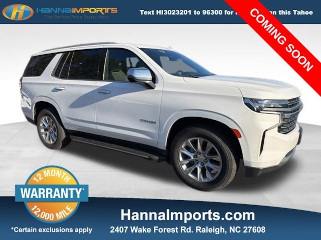 Why shop with Hanna Imports? We specialize in hand-selecting top-quality used cars, trucks, and SUVs for drivers across Raleigh, Durham, Cary, Chapel Hill, and the greater Triangle area of North Carolina. Our massive selection of 1,000+ vehicles on our Raleigh lot is carefully curated to include the most sought-after models, all priced below market value. We believe in transparency and efficiencyâ"our vehicles are aggressively priced from the start, which means no haggling, no hassle, and no wasted time. The price you see is our absolute best price. Whether you're coming from Wake Forest, Apex, Garner, or anywhere in central NC, weâre committed to making your car-buying experience smooth, affordable, and enjoyable. Come see why Hanna Imports is one of the most trusted used car dealerships in North Carolina! Used Chevrolet Tahoe in Raleigh. Used Chevrolet Tahoe in North Carolina, Preferred Equipment Group 1LZ (1st & 2nd Row Color-Keyed Carpeted Floor Mats, 2-Speed Active Electronic AutoTrac Transfer Case, 3rd Row 60/40 Power-Folding Split-Bench Seat, Auto-Dimming Inside Rear-View Mirror, Bose 10-Speaker Centerpoint Surround Audio Sys Ft, Bright Front & Rear Door Sill Plates, Chrome Door Handles w/Body-Color Strip, Chrome Mirror Caps, Color-Keyed Carpeting Floor Covering, Driver & Front Outboard Passenger Airbags, Dual Exhaust System, Enhanced Driver Information Center, Floor Console, Hands-Free Rear Power Programmable Liftgate, Heated 2nd Row Outboard Seats, Heated Steering Wheel, Hill Descent Control, Infotainment Display, Lane Change Alert w/Side Blind Zone Alert, LED Daytime Running Lamps, Memory Settings, Outside Heated Power-Adjustable Mirrors, Power Release 2nd Row Bucket Seats, Power Tilt & Telescopic Steering Column, Rear Cross Traffic Alert, Remote Start, Safety Alert Seat, SiriusXM Radio w/360L, Universal Home Remote, Wireless Charging, and Wrapped Steering Wheel), License Plate Front Mounting Package, Tahoe Premier, 4WD, Jet Black Leather, Heated & Ventilated Driver & Front Passenger Seats, Heated front seats, Heated rear seats, Navigation System, Power Liftgate, 10 Speakers, 20" x 9" Polished Aluminum Wheels, 3.23 Rear Axle Ratio, 3rd row seats: split-bench, 4-Wheel Disc Brakes, ABS brakes, Adaptive suspension, Air Conditioning, Alloy wheels, AM/FM radio: SiriusXM with 360L, Apple CarPlay/Android Auto, Auto High-beam Headlights, Auto-dimming door mirrors, Auto-dimming Rear-View mirror, Auto-leveling suspension, Automatic temperature control, Brake assist, Bumpers: body-color, Compass, Delay-off headlights, Deleted 3 Years of Remote Access, Driver door bin, Driver vanity mirror, Dual front impact airbags,