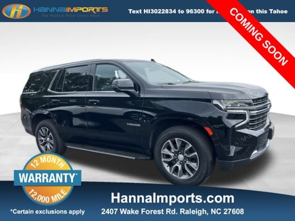 Why shop with Hanna Imports? We specialize in hand-selecting top-quality used cars, trucks, and SUVs for drivers across Raleigh, Durham, Cary, Chapel Hill, and the greater Triangle area of North Carolina. Our massive selection of 1,000+ vehicles on our Raleigh lot is carefully curated to include the most sought-after models, all priced below market value. We believe in transparency and efficiencyâ"our vehicles are aggressively priced from the start, which means no haggling, no hassle, and no wasted time. The price you see is our absolute best price. Whether you're coming from Wake Forest, Apex, Garner, or anywhere in central NC, weâre committed to making your car-buying experience smooth, affordable, and enjoyable. Come see why Hanna Imports is one of the most trusted used car dealerships in North Carolina! Used Chevrolet Tahoe in Raleigh. Used Chevrolet Tahoe in North Carolina, Driver Alert Package (Lane Change Alert w/Side Blind Zone Alert and Rear Cross Traffic Alert), Luxury Package (2nd Row Pwr Release 60/40 Split-Folding Bench Seat, 3rd Row 60/40 Power-Folding Split-Bench Seat, HD Surround Vision, Heated 2nd Row Outboard Seats, Heated Steering Wheel, Memory Settings, Outside Heated Power-Adjustable Mirrors, Power Tilt & Telescopic Steering Column, and Rear Pedestrian Alert), Preferred Equipment Group 1LT (1st & 2nd Row Color-Keyed Carpeted Floor Mats, Auto-Dimming Inside Rear-View Mirror, Bose 9-Speaker Stereo Audio System Feature, Bright Front & Rear Door Sill Plates, Color-Keyed Carpeting Floor Covering, Driver & Front Outboard Passenger Airbags, Enhanced Driver Information Center, Floor Console w/Storage Area, Hands-Free Rear Power Programmable Liftgate, Infotainment Display, LED Daytime Running Lamps, Memory Settings for Driver, Remote Start, SiriusXM Radio w/360L, Universal Home Remote, Wireless Charging, and Wrapped Steering Wheel), License Plate Front Mounting Package, Tahoe LT, Black Leather, Apple CarPlay/Android Auto, Navigation System, Power Liftgate, 10-Way Power Driver & Passenger Seat Adjusters, 3.23 Rear Axle Ratio, 3rd row seats: split-bench, 4-Wheel Disc Brakes, 9 Speakers, ABS brakes, Air Conditioning, Alloy wheels, AM/FM radio: SiriusXM with 360L, Auto High-beam Headlights, Auto-dimming Rear-View mirror, Automatic temperature control, Black Name Plates (LPO), Brake assist, Bumpers: body-color, Compass, Delay-off headlights, Driver door bin, Driver vanity mirror, Dual front impact airbags, Dual front side impact airbags, Electronic Stability Control, Emergency communication system: OnStar and Chevrolet connected services capable, Four wheel independent suspension, Front & Rear Black Bowtie Emblems (LPO), Front anti-roll bar, Front Bucket Seats, Front Center Armrest, Front