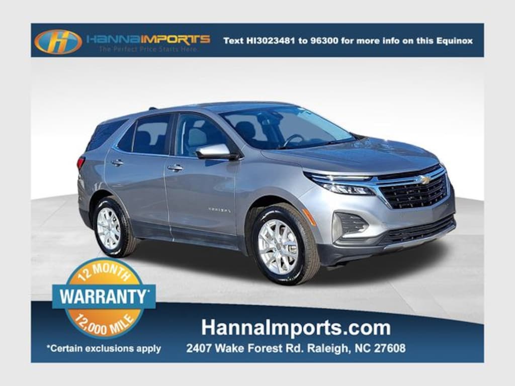Why shop with Hanna Imports? We specialize in hand-selecting top-quality used cars, trucks, and SUVs for drivers across Raleigh, Durham, Cary, Chapel Hill, and the greater Triangle area of North Carolina. Our massive selection of 1,000+ vehicles on our Raleigh lot is carefully curated to include the most sought-after models, all priced below market value. We believe in transparency and efficiencyâ"our vehicles are aggressively priced from the start, which means no haggling, no hassle, and no wasted time. The price you see is our absolute best price. Whether you're coming from Wake Forest, Apex, Garner, or anywhere in central NC, weâre committed to making your car-buying experience smooth, affordable, and enjoyable. Come see why Hanna Imports is one of the most trusted used car dealerships in North Carolina! Used Chevrolet Equinox in Raleigh. Used Chevrolet Equinox in North Carolina, Preferred Equipment Group 1LT, Equinox LT, AWD, 2 USB Ports & Auxiliary Input Jack, Power Liftgate, Remote keyless entry, 17" Aluminum Wheels, 2 Rear USB Charging-Only Ports, 2-Way Power Driver Lumbar Control Seat Adjuster, 3.87 Final Drive Axle Ratio, 4-Wheel Disc Brakes, 6 Speakers, 6-Speaker Audio System Feature, ABS brakes, Air Conditioning, Alloy wheels, AM/FM radio: SiriusXM, Auto High-beam Headlights, Automatic temperature control, Bluetooth® For Phone, Brake assist, Bumpers: body-color, Compass, Delay-off headlights, Deleted 3 Years of OnStar Remote Access, Driver 8-Way Power Seat Adjuster, Driver door bin, Driver vanity mirror, Dual front impact airbags, Dual front side impact airbags, Electronic Stability Control, Emergency communication system: OnStar and Chevrolet connected services capable, Four wheel independent suspension, Front anti-roll bar, Front Bucket Seats, Front Center Armrest, Front dual zone A/C, Front Passenger 4-Way Manual Seat Adjuster, Front reading lights, Fully automatic headlights, Heated door mirrors, Heated Driver & Front Passenger Seats, Heated front seats, Illuminated entry, Low tire pressure warning, Occupant sensing airbag, Outside temperature display, Overhead airbag, Overhead console, Panic alarm, Passenger door bin, Passenger vanity mirror, Power door mirrors, Power driver seat, Power steering, Power windows, Premium audio system: Chevrolet Infotainment 3, Premium Cloth Seat Trim, Radio data system, Radio: Chevrolet Infotainment 3 System w/AM/FM, Rear anti-roll bar, Rear reading lights, Rear seat center armrest, Rear window defroster, Rear window wiper, Security system, SiriusXM, Speed control, Speed-sensing steering, Split folding rear seat, Spoiler, Steering wheel mounted audio controls, Tachometer, Telescoping steering wheel, Tilt steering wheel, Traction control, Trip computer, and Variably intermittent wipers.
