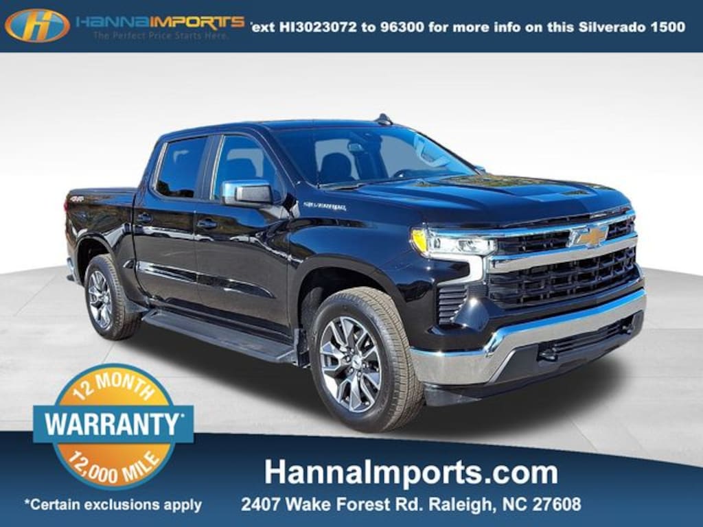 Why shop with Hanna Imports? We specialize in hand-selecting top-quality used cars, trucks, and SUVs for drivers across Raleigh, Durham, Cary, Chapel Hill, and the greater Triangle area of North Carolina. Our massive selection of 1,000+ vehicles on our Raleigh lot is carefully curated to include the most sought-after models, all priced below market value. We believe in transparency and efficiencyâ"our vehicles are aggressively priced from the start, which means no haggling, no hassle, and no wasted time. The price you see is our absolute best price. Whether you're coming from Wake Forest, Apex, Garner, or anywhere in central NC, weâre committed to making your car-buying experience smooth, affordable, and enjoyable. Come see why Hanna Imports is one of the most trusted used car dealerships in North Carolina! Used Chevrolet Silverado 1500 in Raleigh. Used Chevrolet Silverado 1500 in North Carolina, Convenience Package (10-Way Power Driver Seat w/Lumbar, 120-Volt Interior Power Outlet, Dual Rear USB Ports (Charge Only), Dual-Zone Automatic Climate Control, Heated Driver & Front Outboard Passenger Seats, Heated Steering Wheel, Keyless Open & Start, Wrapped Steering Wheel, and 120-Volt Bed Mounted Power Outlet), High Capacity Suspension Package, Trailering Package (Hitch Guidance), Standard Suspension Package, 8-Speed Automatic, 4WD, Black Cloth, 12.3" Multicolor Reconfigurable Digital Display, 3.42 Rear Axle Ratio, 4-Wheel Disc Brakes, 40/20/40 Front Split-Bench Seat, 6 Speakers, 6-Speaker Audio System, ABS brakes, Air Conditioning, All-Star Edition, Alloy wheels, AM/FM radio: SiriusXM with 360L, Auto High-beam Headlights, Auto-Locking Rear Differential, Automatic Emergency Braking, Automatic temperature control, Bluetooth® For Phone, Brake assist, Bumpers: chrome, Chevrolet Connected Access Capable, Chrome Mirror Caps, Cloth Seat Trim, Color-Keyed Carpeting Floor Covering, Compass, Deep-Tinted Glass, Delay-off headlights, Driver door bin, Driver vanity mirror, Dual front impact airbags, Dual front side impact airbags, Electric Rear-Window Defogger, Electrical Steering Column Lock, Electronic Cruise Control, Electronic Stability Control, Following Distance Indicator, Forward Collision Alert, Front anti-roll bar, Front Center Armrest w/Storage, Front dual zone A/C, Front Frame-Mounted Black Recovery Hooks, Front Pedestrian Braking, Front reading lights, Front wheel independent suspension, Fully automatic headlights, HD Rear Vision Camera, Heated door mirrors, Heated front seats, Heated steering wheel, Illuminated entry, IntelliBeam Automatic High Beam On/Off, Lane Keep Assist w/Lane Departure Warning, LED Cargo Area Lighting, Low tire pressure warning, Occupant sensing airbag, OnStar & Chevrolet Connected Services Capable, Outside temperature display, Overhead airbag, Overhead console, Panic alarm, Passenger door bin, Passenger vanity mirror, Power door mirrors, Power driver seat, Power Front Windows w/Driver Express Up/Down, Power Front Windows w/Passenger Express Down, Power Rear Windows w/Express Down, Power steering, Power windows, Premium audio system: Chevrolet Infotainment 3 Premium, Radio data system, Radio: Chevrolet Infotainment 3 Premium System, Rear 60/40 Folding Bench Seat (Folds Up), Rear reading lights, Rear step bumper, Rear window defroster, Remote keyless entry, Remote Vehicle Starter System, Security system, SiriusXM w/360L, Speed control, Speed-sensing steering, Split folding rear seat, Steering Wheel Audio Controls, Steering wheel mounted