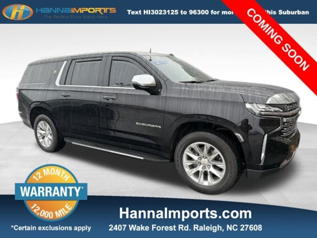 Why shop with Hanna Imports? We specialize in hand-selecting top-quality used cars, trucks, and SUVs for drivers across Raleigh, Durham, Cary, Chapel Hill, and the greater Triangle area of North Carolina. Our massive selection of 1,000+ vehicles on our Raleigh lot is carefully curated to include the most sought-after models, all priced below market value. We believe in transparency and efficiencyâ"our vehicles are aggressively priced from the start, which means no haggling, no hassle, and no wasted time. The price you see is our absolute best price. Whether you're coming from Wake Forest, Apex, Garner, or anywhere in central NC, weâre committed to making your car-buying experience smooth, affordable, and enjoyable. Come see why Hanna Imports is one of the most trusted used car dealerships in North Carolina! Used Chevrolet Suburban in Raleigh. Used Chevrolet Suburban in North Carolina, Preferred Equipment Group 1LZ (12-Way Power Driver & Passenger Seat Adjusters, 1st & 2nd Row Color-Keyed Carpeted Floor Mats, 3rd Row 60/40 Power-Folding Split-Bench, Auto-Dimming Inside Rear-View Mirror, Bose 10-Speaker Surround w/CenterPoint, Bright Front & Rear Door Sill Plates, Chrome Door Handles w/Body-Color Strip, Chrome Mirror Caps, Color-Keyed Carpeting Floor Covering, Driver & Front Outboard Passenger Airbags, Dual Exhaust System, Enhanced Driver Information Center, Floor Console, Hands-Free Rear Power Programmable Liftgate, Heated 2nd Row Outboard Seats, Heated Driver & Front Passenger Seats, Heated Steering Wheel, Infotainment Display, Lane Change Alert w/Side Blind Zone Alert, LED Daytime Running Lamps, Memory Settings, Outside Heated Power-Adjustable Mirrors, Perforated Heated & Ventilated Seats, Power Release 2nd Row Bucket Seats, Power Tilt & Telescopic Steering Column, Rear Cross Traffic Alert, Remote Start, Safety Alert Seat, SiriusXM w/360L, Universal Home Remote, Wireless Charging, and Wrapped Steering Wheel), Suburban Premier, Dual-Pane Power Panoramic Sunroof, Navigation System, Power Liftgate, 10 Speakers, 20" x 9" Polished Aluminum Wheels, 3.23 Rear Axle Ratio, 3rd row seats: split-bench, 4-Wheel Disc Brakes, ABS brakes, Adaptive suspension, Air Conditioning, Alloy wheels, AM/FM radio: SiriusXM with 360L, Apple CarPlay/Android Auto, Auto High-beam Headlights, Auto-dimming door mirrors, Auto-dimming Rear-View mirror, Auto-leveling suspension, Automatic temperature control, Brake assist, Bumpers: body-color, Compass, Delay-off headlights, Driver door bin, Driver vanity mirror, Dual front impact airbags, Dual front side impact airbags, Electronic Stability Control, Emergency communication system: OnStar and Chevrolet connected services capable,