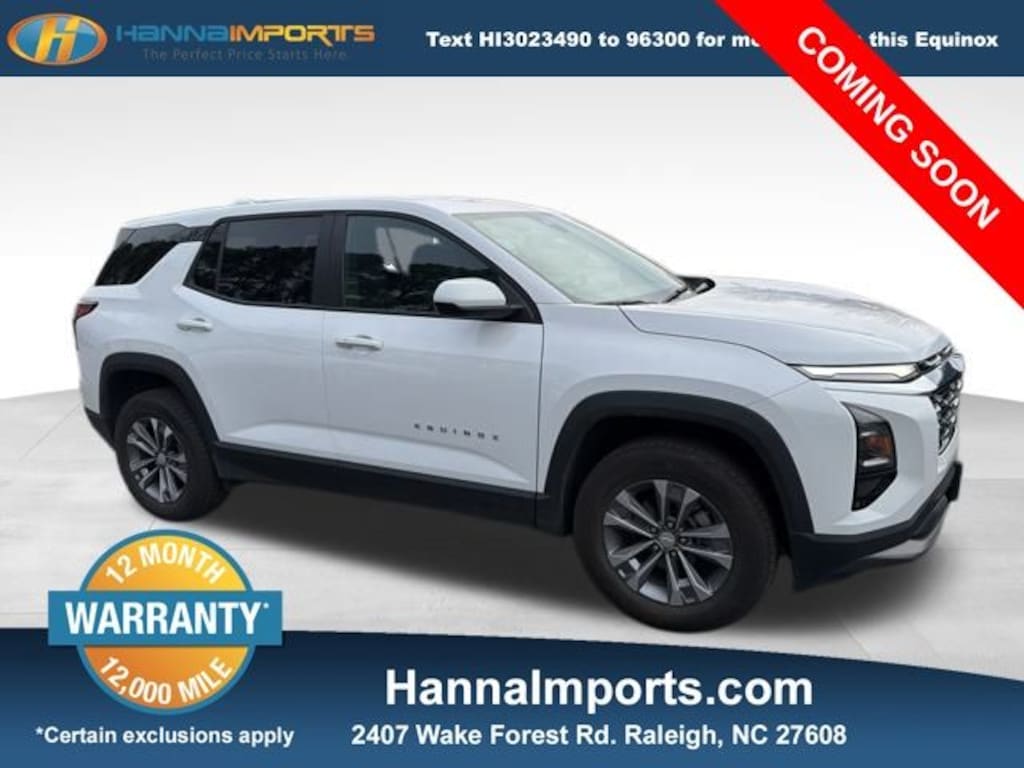 Why shop with Hanna Imports? We specialize in hand-selecting top-quality used cars, trucks, and SUVs for drivers across Raleigh, Durham, Cary, Chapel Hill, and the greater Triangle area of North Carolina. Our massive selection of 1,000+ vehicles on our Raleigh lot is carefully curated to include the most sought-after models, all priced below market value. We believe in transparency and efficiencyâ"our vehicles are aggressively priced from the start, which means no haggling, no hassle, and no wasted time. The price you see is our absolute best price. Whether you're coming from Wake Forest, Apex, Garner, or anywhere in central NC, weâre committed to making your car-buying experience smooth, affordable, and enjoyable. Come see why Hanna Imports is one of the most trusted used car dealerships in North Carolina! Used Chevrolet Equinox in Raleigh. Used Chevrolet Equinox in North Carolina, Preferred Equipment Group 2LT, Equinox LT, AWD, Heated front seats, Navigation System, Remote keyless entry, 3.47 Final Drive Axle Ratio, 4-Wheel Disc Brakes, 6 Speakers, ABS brakes, Air Conditioning, Alloy wheels, AM/FM radio: SiriusXM, Auto High-beam Headlights, Brake assist, Bumpers: body-color, Cloth Seat Trim, Compass, Delay-off headlights, Driver 6-Way Manual Seat Adjuster, Driver door bin, Driver vanity mirror, Dual front impact airbags, Dual front side impact airbags, Electronic Stability Control, Emergency communication system: OnStar and Chevrolet connected services capable, Four wheel independent suspension, Front anti-roll bar, Front Bucket Seats, Front Center Armrest, Front Passenger 4-Way Manual Seat Adjuster, Front reading lights, Fully automatic headlights, Heated door mirrors, Heated Driver & Front Passenger Seats, Heated steering wheel, Illuminated entry, Low tire pressure warning, Occupant sensing airbag, Outside temperature display, Overhead airbag, Overhead console, Panic alarm, Passenger door bin, Passenger vanity mirror, Power door mirrors, Power steering, Power windows, Premium audio system: Chevrolet Infotainment 3, Radio data system, Radio: 11.3" Diagonal Advanced Color LCD Display, Rear anti-roll bar, Rear reading lights, Rear seat center armrest, Rear window defroster, Rear window wiper, Security system, SiriusXM, Speed control, Speed-sensing steering, Split folding rear seat, Spoiler, Steering wheel mounted audio controls, Tachometer, Telescoping steering wheel, Tilt steering wheel, Traction control, Trip computer, Variably intermittent wipers, and Wheels: 17" Grazen Metallic Machined-Face Aluminum.