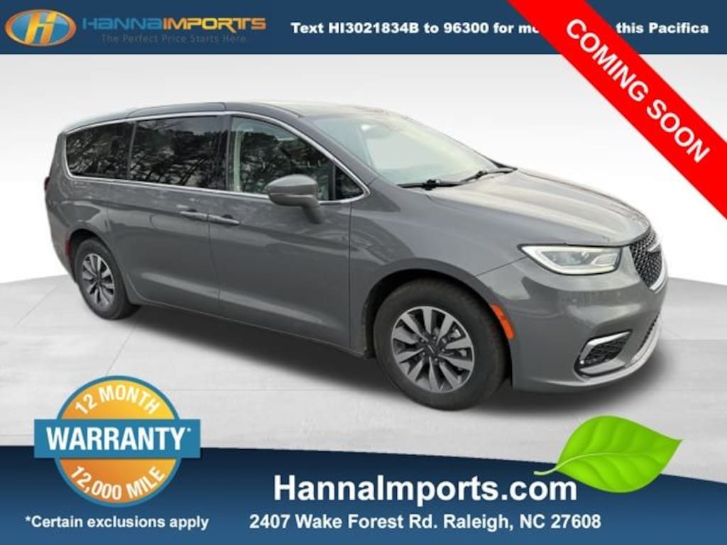 Why shop with Hanna Imports? We specialize in hand-selecting top-quality used cars, trucks, and SUVs for drivers across Raleigh, Durham, Cary, Chapel Hill, and the greater Triangle area of North Carolina. Our massive selection of 1,000+ vehicles on our Raleigh lot is carefully curated to include the most sought-after models, all priced below market value. We believe in transparency and efficiencyâ"our vehicles are aggressively priced from the start, which means no haggling, no hassle, and no wasted time. The price you see is our absolute best price. Whether you're coming from Wake Forest, Apex, Garner, or anywhere in central NC, weâre committed to making your car-buying experience smooth, affordable, and enjoyable. Come see why Hanna Imports is one of the most trusted used car dealerships in North Carolina! Used Chrysler Pacifica Hybrid in Raleigh. Used Chrysler Pacifica Hybrid in North Carolina, Quick Order Package 2EL, Safety Sphere Unavailable (ParkSense Rear Park Assist w/Stop and ParkView Rear Back-Up Camera), Pacifica Hybrid Touring L, 3.6L V6, 10.1" Touchscreen Display, Apple CarPlay, Apple CarPlay/Android Auto, Exterior Parking Camera Rear, Power Liftgate, Remote keyless entry, 3.59 Axle Ratio, 3rd row seats: split-bench, 4-Wheel Disc Brakes, 6 Speakers, ABS brakes, Air Conditioning, Alloy wheels, AM/FM radio: SiriusXM, Auto-dimming Rear-View mirror, Automatic temperature control, Black Seats, Brake assist, Bumpers: body-color, Compass, Delay-off headlights, Disassociated Touchscreen Display, Driver door bin, Driver vanity mirror, Driver's Seat Mounted Armrest, Dual front impact airbags, Dual front side impact airbags, Electronic Stability Control, Emergency communication system: Uconnect Access, For More Info, Call 800-643-2112, Four wheel independent suspension, Front anti-roll bar, Front Bucket Seats, Front dual zone A/C, Front Fascia Air Deflectors, Front fog lights, Front reading lights, Fully automatic headlights, Garage door transmitter, Google Android Auto, GPS Antenna Input, Heated door mirrors, Heated front seats, Heated steering wheel, Heavy Duty Suspension, Illuminated entry, Integrated Active Noise Cancellation, Integrated Center Stack Radio, Knee airbag, Low tire pressure warning, Memory seat, Occupant sensing airbag, Outside temperature display, Overhead airbag, Overhead console, Panic alarm, Passenger door bin, Passenger seat mounted armrest, Passenger vanity mirror, Perforated Leather Trim Bucket Seats, Power door mirrors, Power driver seat, Power steering, Power windows, Radio data system, Radio: Uconnect 5 w/10.1" Display, Rain sensing wipers, Rear air conditioning, Rear reading lights, Rear window defroster, Rear window wiper, Reclining 3rd row seat, Security system, SiriusXM Radio Service, SiriusXM Satellite Radio, Speed control, Split folding rear seat, Spoiler, Steering wheel mounted audio controls, Tachometer, Telescoping steering wheel, Tilt steering wheel, Traction control, Trip computer, Turn signal indicator mirrors, USB Host Flip, Variably intermittent wipers, Voltmeter, and Wheels: 17" x 7.0" Diamond Cut w/Painted Pockets.
