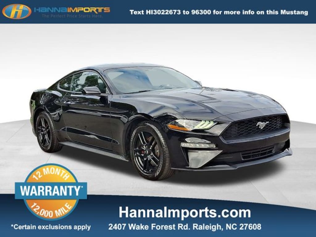 Why shop with Hanna Imports? We specialize in hand-selecting top-quality used cars, trucks, and SUVs for drivers across Raleigh, Durham, Cary, Chapel Hill, and the greater Triangle area of North Carolina. Our massive selection of 1,000+ vehicles on our Raleigh lot is carefully curated to include the most sought-after models, all priced below market value. We believe in transparency and efficiencyâ"our vehicles are aggressively priced from the start, which means no haggling, no hassle, and no wasted time. The price you see is our absolute best price. Whether you're coming from Wake Forest, Apex, Garner, or anywhere in central NC, weâre committed to making your car-buying experience smooth, affordable, and enjoyable. Come see why Hanna Imports is one of the most trusted used car dealerships in North Carolina! Used Ford Mustang in Raleigh. Used Ford Mustang in North Carolina, Equipment Group 101A (AM/FM Stereo w/MP3 Player, Body-Color Blade Decklid Spoiler, Cloth Bucket Seats, Dual-Zone Automatic Temperature Control, Reverse Sensing System, Wheels: 18" x 8" Machined-Face Aluminum, SiriusXM Radio, and SYNC 3 Communications & Entertainment System), Mustang EcoBoost, Exterior Parking Camera Rear, Remote keyless entry, 4-Wheel Disc Brakes, ABS brakes, Air Conditioning, Alloy wheels, AM/FM Stereo, Auto-dimming Rear-View mirror, Brake assist, Bumpers: body-color, Compass, Delay-off headlights, Driver door bin, Driver vanity mirror, Dual front impact airbags, Dual front side impact airbags, Electronic Stability Control, Emergency communication system: 911 Assist, Four wheel independent suspension, Front anti-roll bar, Front Bucket Seats, Front Center Armrest, Front reading lights, Fully automatic headlights, Illuminated entry, Knee airbag, Leather Shift Knob, Low tire pressure warning, Occupant sensing airbag, Outside temperature display, Overhead airbag, Overhead console, Panic alarm, Passenger door bin, Passenger vanity mirror, Power door mirrors, Power steering, Power windows, Radio data system, Rear anti-roll bar, Rear window defroster, Security system, Speed control, Speed-sensing steering, Speed-Sensitive Wipers, Split folding rear seat, Steering wheel mounted audio controls, Tachometer, Telescoping steering wheel, Tilt steering wheel, Traction control, Trip computer, Variably intermittent wipers, and Voltmeter.