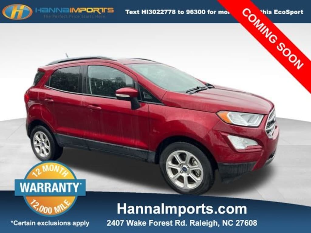 Why shop with Hanna Imports? We specialize in hand-selecting top-quality used cars, trucks, and SUVs for drivers across Raleigh, Durham, Cary, Chapel Hill, and the greater Triangle area of North Carolina. Our massive selection of 1,000+ vehicles on our Raleigh lot is carefully curated to include the most sought-after models, all priced below market value. We believe in transparency and efficiencyâ€"our vehicles are aggressively priced from the start, which means no haggling, no hassle, and no wasted time. The price you see is our absolute best price. Whether you're coming from Wake Forest, Apex, Garner, or anywhere in central NC, we’re committed to making your car-buying experience smooth, affordable, and enjoyable. Come see why Hanna Imports is one of the most trusted used car dealerships in North Carolina! Used Ford EcoSport in Raleigh. Used Ford EcoSport in North Carolina, Equipment Group 200A, EcoSport SE, AppLink/Apple CarPlay and Android Auto, Exterior Parking Camera Rear, Rear Parking Sensors, 3.44 Axle Ratio, 4-Wheel Disc Brakes, 6 Speakers, ABS brakes, Air Conditioning, Alloy wheels, AM/FM radio: SiriusXM, Automatic temperature control, Brake assist, Bumpers: body-color, Compass, Delay-off headlights, Driver door bin, Driver vanity mirror, Dual front impact airbags, Dual front side impact airbags, Electronic Stability Control, Emergency communication system: SYNC 3 911 Assist, Front anti-roll bar, Front Bucket Seats, Front Center Armrest, Front fog lights, Front reading lights, Front wheel independent suspension, Fully automatic headlights, Heated front seats, Illuminated entry, Knee airbag, Leather Shift Knob, Low tire pressure warning, Occupant sensing airbag, Outside temperature display, Overhead airbag, Overhead console, Panic alarm, Passenger door bin, Passenger vanity mirror, Power door mirrors, Power moonroof, Power steering, Power windows, Radio data system, Radio: AM/FM/MP3 Stereo, Rear seat center armrest, Rear side impact airbag, Rear window defroster, Rear window wiper, Remote keyless entry, Roof rack: rails only, SiriusXM Radio, Speed control, Speed-sensing steering, Split folding rear seat, Steering wheel mounted audio controls, SYNC 3 Communications & Entertainment System, Tachometer, Telescoping steering wheel, Tilt steering wheel, Traction control, Trip computer, Turn signal indicator mirrors, Unique Cloth Heated Front Bucket Seats, Variably intermittent wipers, and Wheels: 16" Shadow Silver-Painted Aluminum.