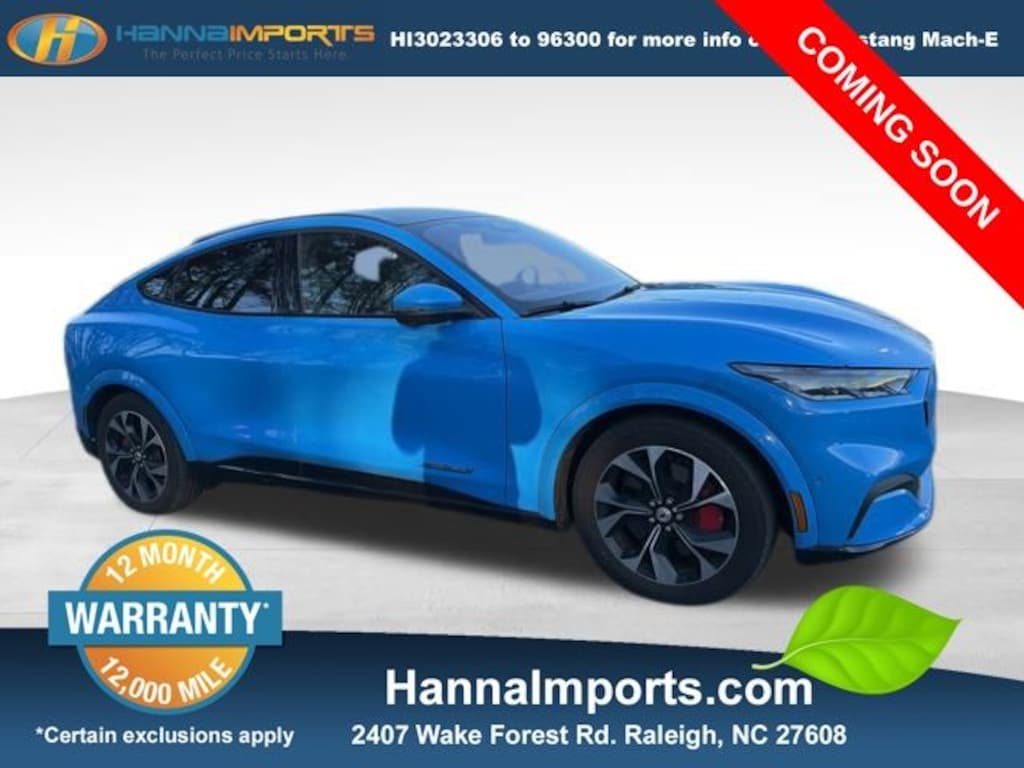 Why shop with Hanna Imports? We specialize in hand-selecting top-quality used cars, trucks, and SUVs for drivers across Raleigh, Durham, Cary, Chapel Hill, and the greater Triangle area of North Carolina. Our massive selection of 1,000+ vehicles on our Raleigh lot is carefully curated to include the most sought-after models, all priced below market value. We believe in transparency and efficiencyâ"our vehicles are aggressively priced from the start, which means no haggling, no hassle, and no wasted time. The price you see is our absolute best price. Whether you're coming from Wake Forest, Apex, Garner, or anywhere in central NC, weâre committed to making your car-buying experience smooth, affordable, and enjoyable. Come see why Hanna Imports is one of the most trusted used car dealerships in North Carolina! Used Ford Mustang Mach-E in Raleigh. Used Ford Mustang Mach-E in North Carolina, Equipment Group 301A (Body Color Painted Wheel Lip Moldings, Body Color Sideview Mirror Caps, and Heated Perforated ActiveX Bucket Seats (L)), First Edition Package, Mustang Mach-E Premium, AWD, Apple CarPlay/Android Auto, Exterior Parking Camera Rear, Navigation system: Connected Navigation, Power Liftgate, Remote keyless entry, 10 Speakers, 4-Wheel Disc Brakes, ABS brakes, Air Conditioning, Alloy wheels, AM/FM radio: SiriusXM, AM/FM Stereo, Auto High-beam Headlights, Auto-dimming Rear-View mirror, Automatic temperature control, Axle Ratio: 9.05, Brake assist, Bumpers: body-color, Compass, Delay-off headlights, Driver door bin, Driver vanity mirror, Dual front impact airbags, Dual front side impact airbags, Electronic Stability Control, Emergency communication system: 911 Assist, Four wheel independent suspension, Front anti-roll bar, Front Bucket Seats, Front Center Armrest, Front dual zone A/C, Front reading lights, Fully automatic headlights, Garage door transmitter, Heated door mirrors, Heated front seats, Heated Perforated ActiveX Bucket Seats, Heated steering wheel, Illuminated entry, Knee airbag, Low tire pressure warning, Memory seat, Occupant sensing airbag, Outside temperature display, Overhead airbag, Overhead console, Panic alarm, Passenger door bin, Passenger vanity mirror, Power door mirrors, Power driver seat, Power passenger seat, Power steering, Power windows, Radio data system, Rain sensing wipers, Rear anti-roll bar, Rear seat center armrest, Rear side impact airbag, Rear window defroster, Rear window wiper, Security system, SiriusXM Radio w/360L, Speed control, Speed-sensing steering, Speed-Sensitive Wipers, Split folding rear seat, Spoiler, Steering wheel mounted audio controls, SYNC 4A w/Enhanced Voice Recognition, Telescoping steering wheel, Tilt steering wheel, Traction control, Trip computer, Turn signal indicator mirrors, Variably intermittent wipers, and Wheels: 19" Machined-Face Aluminum.