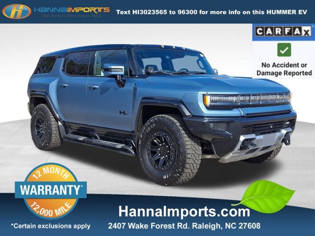 Why shop with Hanna Imports? We specialize in hand-selecting top-quality used cars, trucks, and SUVs for drivers across Raleigh, Durham, Cary, Chapel Hill, and the greater Triangle area of North Carolina. Our massive selection of 1,000+ vehicles on our Raleigh lot is carefully curated to include the most sought-after models, all priced below market value. We believe in transparency and efficiencyâ"our vehicles are aggressively priced from the start, which means no haggling, no hassle, and no wasted time. The price you see is our absolute best price. Whether you're coming from Wake Forest, Apex, Garner, or anywhere in central NC, weâre committed to making your car-buying experience smooth, affordable, and enjoyable. Come see why Hanna Imports is one of the most trusted used car dealerships in North Carolina! Used GMC Hummer EV SUV in Raleigh. Used GMC Hummer EV SUV in North Carolina, Extreme Off-Road Package (1-Motor Front Drive Unit, Black Rear D-Ring Recovery Hook (LPO), Driver-Selectable Front Differential, Driver-Selectable Rear Differential, Rocker Protectors w/Assist Steps (LPO), Underbody Cameras, and Wheels: 18" x 9" Black Aluminum w/Machined Accents), Illumination Package (LPO) (Accessory Touch-Screen Control Switches (LPO), Front Footwell Interior LED Lighting Kit (LPO), Front Off-Road Auxiliary Lights (LPO), and Outside Rearview Mirror Projection Lights (LPO)), Omega Edition (Black Emblems (LPO), Black Wheel Center Cap (LPO), Infinity Roof, Premium Carpet Floor Inserts (LPO), Thatcham Wheel Locks (LPO), and Wheels: 18" Gloss Black Beadlock (LPO)), Preferred Equipment Group 1SG, Hummer EV SUV 3X, 4WD, Lunar Horizon (Jet Black/Light Grey) Leather, Apple CarPlay/Android Auto, Navigation System, Remote keyless entry, 10.49 Final Drive Ratio, 12-Way Power Driver Seat Adjuster, 12-Way Power Passenger Seat Adjuster, 14 Speakers, 4-Wheel Disc Brakes, ABS brakes, Adaptive suspension, Air Conditioning, Alloy wheels, AM/FM radio: SiriusXM with 360L, Auto High-beam Headlights, Auto-dimming door mirrors, Auto-dimming Rear-View mirror, Automatic temperature control, Bose Centerpoint Premium 14-Speaker Surround Sound, Brake assist, Compass, Delay-off headlights, Driver door bin, Driver Memory, Driver vanity mirror, Dual front impact airbags, Dual front side impact airbags, Electronic Stability Control, Emergency communication system: OnStar, Four wheel independent suspension, Front & Rear Air Ride Adaptive Suspension, Front anti-roll bar, Front Bucket Seats, Front Center Armrest, Front dual zone A/C, Front License Plate Kit, Front reading lights, Garage door transmitter, Heated door mirrors, Heated Driver & Front Passenger Seats, Heated front seats, Heated rear seats, Heated steering wheel, Illuminated entry, Low tire pressure warning, Memory seat, Occupant sensing airbag, Outside temperature display, Overhead console, Panic alarm, Passenger door bin, Passenger vanity mirror, Performance Red Emblems (LPO), Portable Dual Level Charge Cord, Power door mirrors, Power driver seat, Po