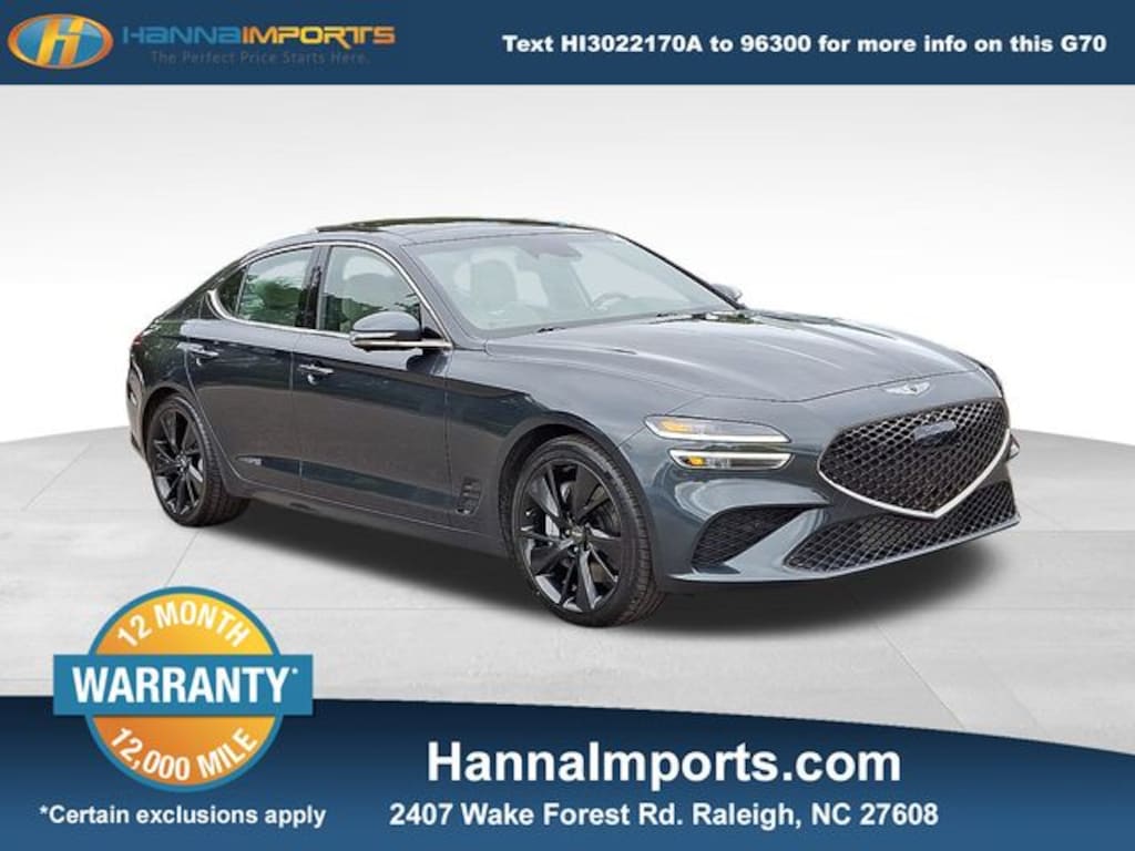 Why shop with Hanna Imports? We specialize in hand-selecting top-quality used cars, trucks, and SUVs for drivers across Raleigh, Durham, Cary, Chapel Hill, and the greater Triangle area of North Carolina. Our massive selection of 1,000+ vehicles on our Raleigh lot is carefully curated to include the most sought-after models, all priced below market value. We believe in transparency and efficiencyâ"our vehicles are aggressively priced from the start, which means no haggling, no hassle, and no wasted time. The price you see is our absolute best price. Whether you're coming from Wake Forest, Apex, Garner, or anywhere in central NC, weâre committed to making your car-buying experience smooth, affordable, and enjoyable. Come see why Hanna Imports is one of the most trusted used car dealerships in North Carolina! Used Genesis G70 in Raleigh. Used Genesis G70 in North Carolina, Sport Advanced Package (Option Group 03, Acoustic Front Door Glass, Alloy Pedals, Dark Chrome Grille & Daylight Opening Trim, Forward & Reverse Parking Distance Warning, Genesis Digital Key, Power Driver Seat Bolster & Cushion Extension, Radio: AM/FM/SiriusXM/HD Lexicon Prem Audio System, Sport Aluminum Trim, Variable Exhaust Valve System, Ventilated Front Seats, Wheels: 19" x 8.0J Fr & 19" x 8.5J Rr Sport Alloy, Wide Sunroof, and Wireless Device Charging), Sport Prestige Package (Brembo Braking System, Electronically Controlled Suspension, Heads-Up Display (HUD), Limited-Slip Differential, Microfiber Suede Headliner & Pillars, Nappa Leather Seating Surfaces, Option Group 04, Power Trunk, and Surround View Monitor w/Blind Spot View Monitor), G70 3.3T, AWD, Exterior Parking Camera Rear, Navigation System, 4-Wheel Disc Brakes, 6 Speakers, ABS brakes, Air Conditioning, Alloy wheels, AM/FM radio: SiriusXM, Android Auto & Apple CarPlay, Anti-whiplash front head restraints, Auto High-beam Headlights, Auto-dimming door mirrors, Auto-dimming Rear-View mirror, Automatic temperature control, Brake assist, Bumper Applique, Bumpers: body-color, Delay-off headlights, Driver door bin, Driver vanity mirror, Dual front impact airbags, Dual front side impact airbags, Electronic Stability Control, Emergency communication system: Genesis Connected Services, Four wheel independent suspension, Front anti-roll bar, Front Bucket Seats, Front Center Armrest, Front dual zone A/C, Front reading lights, Fully automatic headlights, Garage door transmitter: HomeLink, Heated door mirrors, Heated front seats, Heated Multi-Adjustable Front Bucket Seats, Heated steering wheel, Illuminated entry, Knee airbag, Leather Seating Surfaces, Low tire pressure warning, Memory seat, Occupant sensing airbag, Outside temperature display, Overhead airbag, Overhead console, Panic alarm, Passenger door bin, Passenger vanity mirror, Power door mirrors, Power driver seat, Power passenger seat, Power steering, Power windows, Premium First Aid Kit, Radio: AM/FM/SiriusXM/HD Audio System, Rain sensing wipers, Rear anti-roll bar, Rear reading lights, Rear seat center armrest, Rear window defroster, Remote keyless entry, Security system, Speed control, Speed-sensing steering, Speed-Sensitive Wipers, Split folding rear seat, Steering wheel memory, Steering wheel mounted audio controls, Tachometer, Telescoping steering wheel, Traction control, Trip computer, Turn signal indicator mirrors, Variably intermittent wipers, Wheel Locks, and Wheels: 19" x 8.0J Fr & 19" x 8.5J Rr Alloy.
