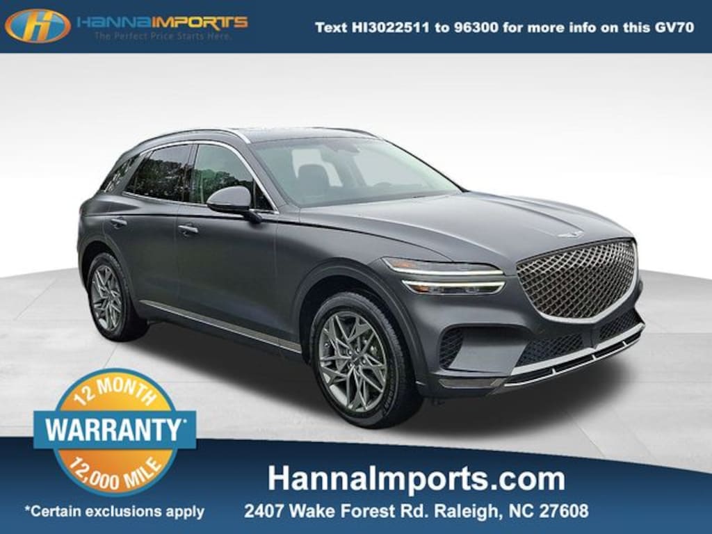 Why shop with Hanna Imports? We specialize in hand-selecting top-quality used cars, trucks, and SUVs for drivers across Raleigh, Durham, Cary, Chapel Hill, and the greater Triangle area of North Carolina. Our massive selection of 1,000+ vehicles on our Raleigh lot is carefully curated to include the most sought-after models, all priced below market value. We believe in transparency and efficiencyâ"our vehicles are aggressively priced from the start, which means no haggling, no hassle, and no wasted time. The price you see is our absolute best price. Whether you're coming from Wake Forest, Apex, Garner, or anywhere in central NC, weâre committed to making your car-buying experience smooth, affordable, and enjoyable. Come see why Hanna Imports is one of the most trusted used car dealerships in North Carolina! Used Genesis GV70 in Raleigh. Used Genesis GV70 in North Carolina, Select Package (Heated Steering Wheel, Integrated Memory System (IMS), Monobloc Front Brakes, Option Group 02, Power Folding ECM Mirrors w/Genesis Logo Lamp, Power Telescoping Steering Wheel, Power Tilt & Slide Panoramic Sunroof, and Ventilated Front Seats), Cargo Package (Cargo Net, First Aid Kit, and Up Seatback Cargo Mat), GV70 2.5T, AWD, Melbourne Gray, Android Auto & Apple CarPlay, Exterior Parking Camera Rear, Navigation System, Power Liftgate, Rear Parking Sensors, 4-Wheel Disc Brakes, 4.181 Axle Ratio, 9 Speakers, ABS brakes, Air Conditioning, Alloy wheels, Aluminum Trim w/Spin Brushed Pattern, AM/FM radio: SiriusXM, Anti-whiplash front head restraints, Auto High-beam Headlights, Auto-dimming Rear-View mirror, Automatic temperature control, Brake assist, Bumpers: body-color, Cargo Cover, Delay-off headlights, Driver door bin, Driver vanity mirror, Dual front impact airbags, Dual front side impact airbags, Electronic Stability Control, Emergency communication system, Four wheel independent suspension, Front anti-roll bar, Front Bucket Seats, Front Center Armrest w/Storage, Front dual zone A/C, Front reading lights, Fully automatic headlights, Garage door transmitter: HomeLink, Heated door mirrors, Heated Front Bucket Seats, Heated front seats, Illuminated entry, Knee airbag, Leatherette Seating Surfaces, Low tire pressure warning, Occupant sensing airbag, Outside temperature display, Overhead airbag, Overhead console, Panic alarm, Passenger door bin, Passenger vanity mirror, Power door mirrors, Power driver seat, Power passenger seat, Power steering, Power windows, Radio: AM/FM/SiriusXM/HD Premium Audio System, Rain sensing wipers, Rear anti-roll bar, Rear reading lights, Rear seat center armrest, Rear window defroster, Rear window wiper, Remote keyless entry, Security system, Speed control, Speed-sensing steering, Speed-Sensitive Wipers, Split folding rear seat, Spoiler, Steering wheel mounted audio controls, Tachometer, Telescoping steering wheel, Tilt steering wheel, Traction control, Trip computer, Turn signal indicator mirrors, Variably intermittent wipers, Wheel Locks, Wheels: 18" Real Steel Gray Alloy, and Wheels: 19" Dark Hyper Silver Aluminum.