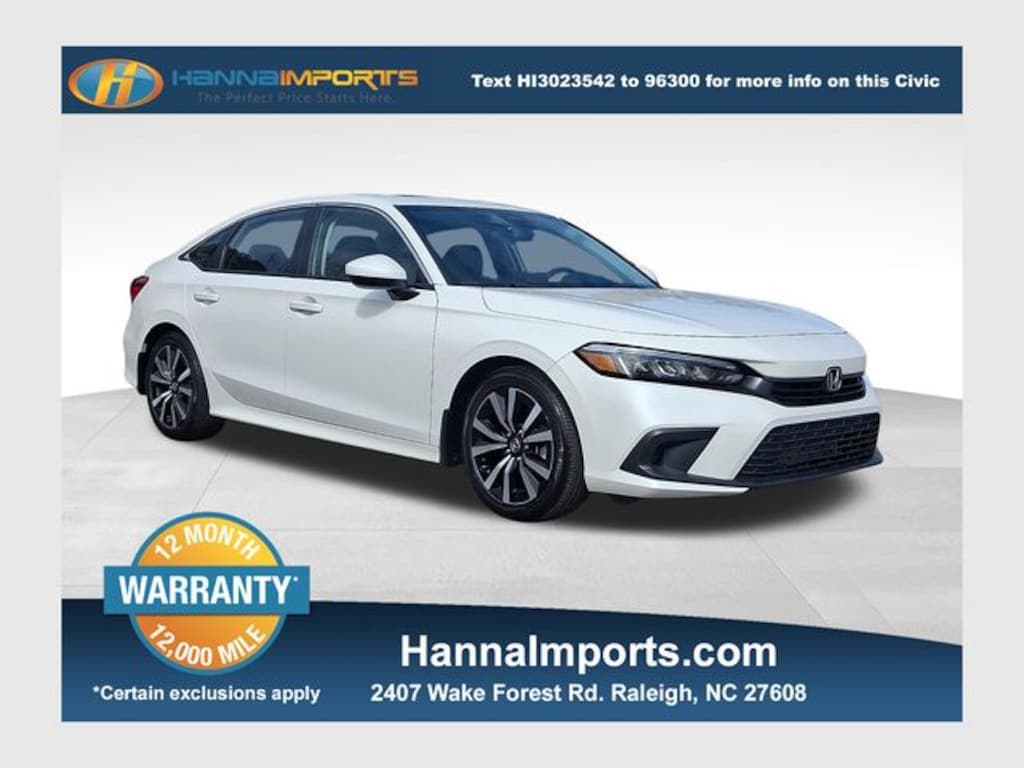Why shop with Hanna Imports? We specialize in hand-selecting top-quality used cars, trucks, and SUVs for drivers across Raleigh, Durham, Cary, Chapel Hill, and the greater Triangle area of North Carolina. Our massive selection of 1,000+ vehicles on our Raleigh lot is carefully curated to include the most sought-after models, all priced below market value. We believe in transparency and efficiencyâ"our vehicles are aggressively priced from the start, which means no haggling, no hassle, and no wasted time. The price you see is our absolute best price. Whether you're coming from Wake Forest, Apex, Garner, or anywhere in central NC, weâre committed to making your car-buying experience smooth, affordable, and enjoyable. Come see why Hanna Imports is one of the most trusted used car dealerships in North Carolina! Used Honda Civic in Raleigh. Used Honda Civic in North Carolina, Civic EX, Black w/Cloth Seating Surfaces, Adaptive Cruise Control: Adaptive Cruise Control (ACC) with Low-Speed Follow, Apple CarPlay/Android Auto, Blind Spot Information (BSI) System warning, Exterior Parking Camera Rear, Power moonroof, 4-Wheel Disc Brakes, 8 Speakers, ABS brakes, Air Conditioning, Alloy wheels, AM/FM radio, Auto High-beam Headlights, Automatic temperature control, Brake assist, Bumpers: body-color, Cloth Seating Surfaces, Delay-off headlights, Driver door bin, Driver vanity mirror, Dual front impact airbags, Dual front side impact airbags, Electronic Stability Control, Emergency communication system: HondaLink, Four wheel independent suspension, Front anti-roll bar, Front Bucket Seats, Front Center Armrest, Front dual zone A/C, Front reading lights, Fully automatic headlights, Heated door mirrors, Heated Front Bucket Seats, Heated front seats, Illuminated entry, Knee airbag, Leather Shift Knob, Leather steering wheel, Low tire pressure warning, Occupant sensing airbag, Outside temperature display, Overhead airbag, Overhead console, Panic alarm, Passenger door bin, Passenger vanity mirror, Power door mirrors, Power steering, Power windows, Radio data system, Radio: 180-Watt Audio System, Rear anti-roll bar, Rear seat center armrest, Rear side impact airbag, Rear window defroster, Remote keyless entry, Security system, Speed control, Speed-sensing steering, Split folding rear seat, Steering wheel mounted audio controls, Tachometer, Telescoping steering wheel, Tilt steering wheel, Traction control, Trip computer, Variably intermittent wipers, and Wheels: 17" Alloy w/Gloss Black Inserts.