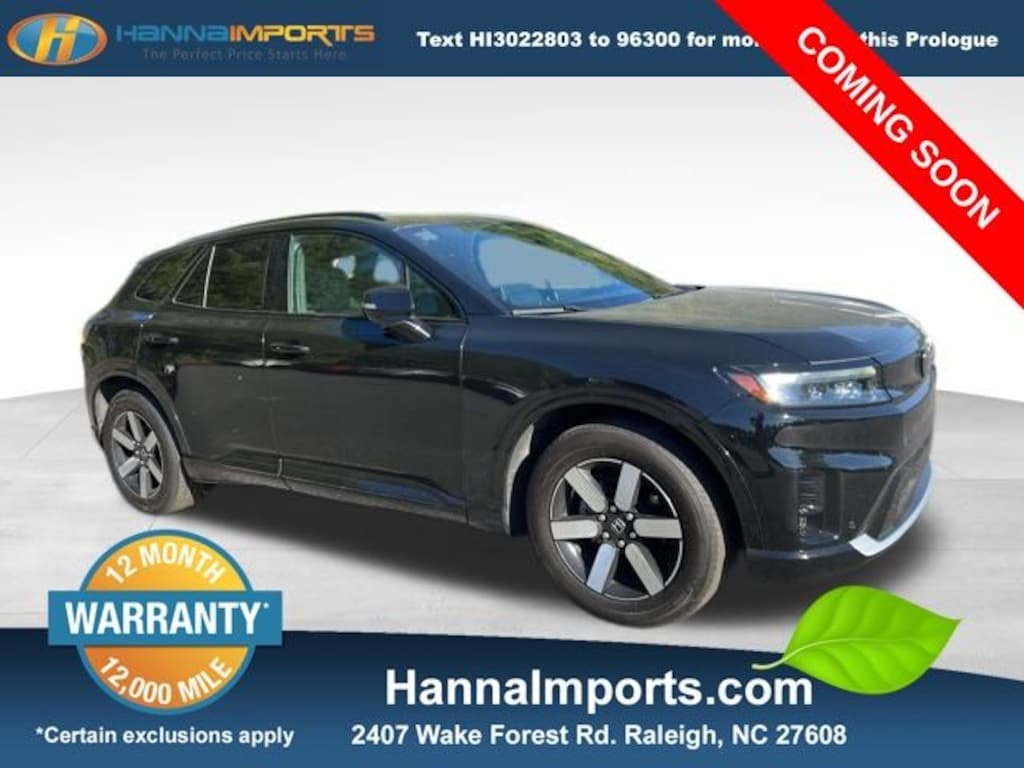 Why shop with Hanna Imports? We specialize in hand-selecting top-quality used cars, trucks, and SUVs for drivers across Raleigh, Durham, Cary, Chapel Hill, and the greater Triangle area of North Carolina. Our massive selection of 1,000+ vehicles on our Raleigh lot is carefully curated to include the most sought-after models, all priced below market value. We believe in transparency and efficiencyâ"our vehicles are aggressively priced from the start, which means no haggling, no hassle, and no wasted time. The price you see is our absolute best price. Whether you're coming from Wake Forest, Apex, Garner, or anywhere in central NC, weâre committed to making your car-buying experience smooth, affordable, and enjoyable. Come see why Hanna Imports is one of the most trusted used car dealerships in North Carolina! Used Honda Prologue in Raleigh. Used Honda Prologue in North Carolina, Prologue Touring, Electric ZEV 288hp, AWD, Apple CarPlay/Android Auto, Exterior Parking Camera Rear, Lane departure: Lane Keeping Assist System (LKAS) active, Navigation System, Power Liftgate, Power moonroof, 12 Speakers, 19" x 8.5" Alloy Wheels, 4-Wheel Disc Brakes, ABS brakes, Air Conditioning, Alloy wheels, AM/FM radio: SiriusXM, Auto High-beam Headlights, Auto-dimming Rear-View mirror, Automatic temperature control, Axle Ratio: TBD, Bose Premium Audio System, Brake assist, Bumpers: body-color, Compass, Delay-off headlights, Driver door bin, Driver vanity mirror, Dual front impact airbags, Dual front side impact airbags, Electronic Stability Control, Emergency communication system: HondaLink connected by OnStar, Four wheel independent suspension, Front anti-roll bar, Front Bucket Seats, Front Center Armrest, Front dual zone A/C, Front fog lights, Front reading lights, Fully automatic headlights, Garage door transmitter: HomeLink, Heated door mirrors, Heated Front Bucket Seats, Heated front seats, Illuminated entry, Knee airbag, Leather Seat Trim, Leather steering wheel, Low tire pressure warning, Memory seat, Occupant sensing airbag, Outside temperature display, Overhead airbag, Overhead console, Panic alarm, Passenger door bin, Passenger vanity mirror, Power door mirrors, Power driver seat, Power passenger seat, Power steering, Power windows, Rear anti-roll bar, Rear reading lights, Rear seat center armrest, Rear window defroster, Rear window wiper, Remote keyless entry, Speed control, Split folding rear seat, Spoiler, Steering wheel mounted audio controls, Telescoping steering wheel, Tilt steering wheel, Traction control, Trip computer, Turn signal indicator mirrors, and Variably intermittent wipers.