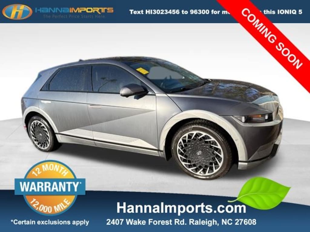 Why shop with Hanna Imports? We specialize in hand-selecting top-quality used cars, trucks, and SUVs for drivers across Raleigh, Durham, Cary, Chapel Hill, and the greater Triangle area of North Carolina. Our massive selection of 1,000+ vehicles on our Raleigh lot is carefully curated to include the most sought-after models, all priced below market value. We believe in transparency and efficiencyâ"our vehicles are aggressively priced from the start, which means no haggling, no hassle, and no wasted time. The price you see is our absolute best price. Whether you're coming from Wake Forest, Apex, Garner, or anywhere in central NC, weâre committed to making your car-buying experience smooth, affordable, and enjoyable. Come see why Hanna Imports is one of the most trusted used car dealerships in North Carolina! Used Hyundai IONIQ 5 in Raleigh. Used Hyundai IONIQ 5 in North Carolina, Option Group 01, IONIQ 5 Limited, AWD, Apple CarPlay & Android Auto, Exterior Parking Camera Rear, Heated & Ventilated Front Bucket Seats, Navigation System, Power Liftgate, 4-Wheel Disc Brakes, 4.706 Axle Ratio, 8 Speakers, ABS brakes, Air Conditioning, Alloy wheels, AM/FM radio: SiriusXM, Auto High-beam Headlights, Auto-dimming Rear-View mirror, Automatic temperature control, Bodyside moldings, Brake assist, Bumpers: body-color, Cargo Net, Carpeted Floor Mats, Delay-off headlights, Driver door bin, Driver vanity mirror, Dual front impact airbags, Dual front side impact airbags, Electronic Stability Control, Emergency communication system: Blue Link Connected Car Service (3-year complimentary subscription), First Aid Kit, Four wheel independent suspension, Front anti-roll bar, Front Bucket Seats, Front Center Armrest w/Storage, Front dual zone A/C, Front reading lights, Fully automatic headlights, Garage door transmitter: HomeLink, H-Tex Leatherette Seating Surfaces, Heads-Up Display, Heated door mirrors, Heated front seats, Heated steering wheel, Illuminated entry, Leather steering wheel, Low tire pressure warning, Memory seat, Mudguards, Occupant sensing airbag, Outside temperature display, Overhead airbag, Overhead console, Panic alarm, Passenger door bin, Passenger vanity mirror, Power door mirrors, Power driver seat, Power passenger seat, Power steering, Power windows, Radio: AM/FM/SiriusXM/HD Display Audio System, Rain sensing wipers, Rear anti-roll bar, Rear reading lights, Rear seat center armrest, Rear window defroster, Remote keyless entry, Security system, Speed control, Speed-sensing steering, Split folding rear seat, Spoiler, Steering wheel mounted audio controls, Telescoping steering wheel, Tilt steering wheel, Traction control, Trip computer, Turn signal indicator mirrors, Up Seatback Cargo Mat, Variably intermittent wipers, Ventilated front seats, Wheel Locks, and Wheels: 20" x 8.5J Aero Alloy.