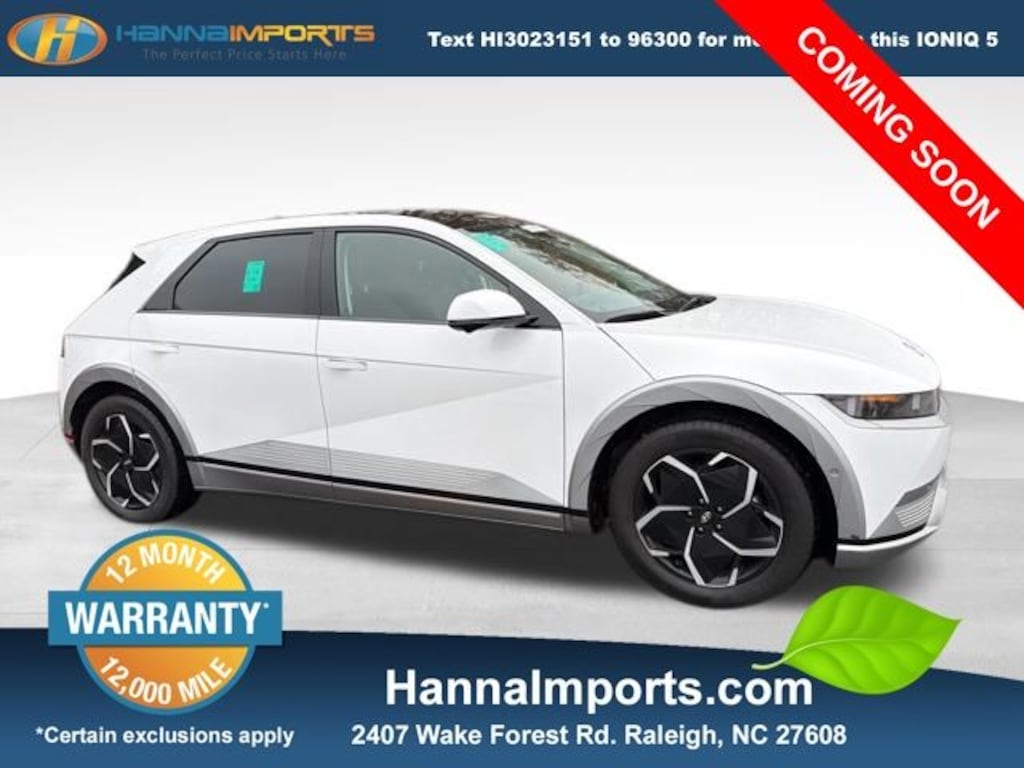 Why shop with Hanna Imports? We specialize in hand-selecting top-quality used cars, trucks, and SUVs for drivers across Raleigh, Durham, Cary, Chapel Hill, and the greater Triangle area of North Carolina. Our massive selection of 1,000+ vehicles on our Raleigh lot is carefully curated to include the most sought-after models, all priced below market value. We believe in transparency and efficiencyâ"our vehicles are aggressively priced from the start, which means no haggling, no hassle, and no wasted time. The price you see is our absolute best price. Whether you're coming from Wake Forest, Apex, Garner, or anywhere in central NC, weâre committed to making your car-buying experience smooth, affordable, and enjoyable. Come see why Hanna Imports is one of the most trusted used car dealerships in North Carolina! Used Hyundai IONIQ 5 in Raleigh. Used Hyundai IONIQ 5 in North Carolina, Option Group 01, IONIQ 5 Limited, Apple CarPlay & Android Auto, Exterior Parking Camera Rear, Heads-Up Display, Heated & Ventilated Front Bucket Seats, Navigation System, Power Liftgate, Remote keyless entry, Steering wheel mounted audio controls, 4-Wheel Disc Brakes, 4.706 Axle Ratio, 8 Speakers, ABS brakes, Air Conditioning, Alloy wheels, AM/FM radio: SiriusXM, Auto High-beam Headlights, Auto-dimming Rear-View mirror, Automatic temperature control, Bodyside moldings, Brake assist, Bumpers: body-color, Cargo Net, Carpeted Floor Mats, Delay-off headlights, Driver door bin, Driver vanity mirror, Dual front impact airbags, Dual front side impact airbags, Electronic Stability Control, Emergency communication system: Blue Link Connected Car Service (3-year complimentary subscription), First Aid Kit, Four wheel independent suspension, Front anti-roll bar, Front Bucket Seats, Front Center Armrest w/Storage, Front dual zone A/C, Front reading lights, Fully automatic headlights, Garage door transmitter: HomeLink, H-Tex Leatherette Seating Surfaces, Heated door mirrors, Heated front seats, Heated steering wheel, Illuminated entry, Leather steering wheel, Low tire pressure warning, Memory seat, Occupant sensing airbag, Outside temperature display, Overhead airbag, Overhead console, Panic alarm, Passenger door bin, Passenger vanity mirror, Power door mirrors, Power driver seat, Power passenger seat, Power steering, Power windows, Radio: AM/FM/SiriusXM/HD Display Audio System, Rain sensing wipers, Rear anti-roll bar, Rear reading lights, Rear seat center armrest, Rear window defroster, Security system, Speed control, Speed-sensing steering, Split folding rear seat, Spoiler, Telescoping steering wheel, Tilt steering wheel, Traction control, Trip computer, Turn signal indicator mirrors, Up Seatback Cargo Mat, Variably intermittent wipers, Ventilated front seats, and Wheels: 19" x 7.5J Aero Alloy.