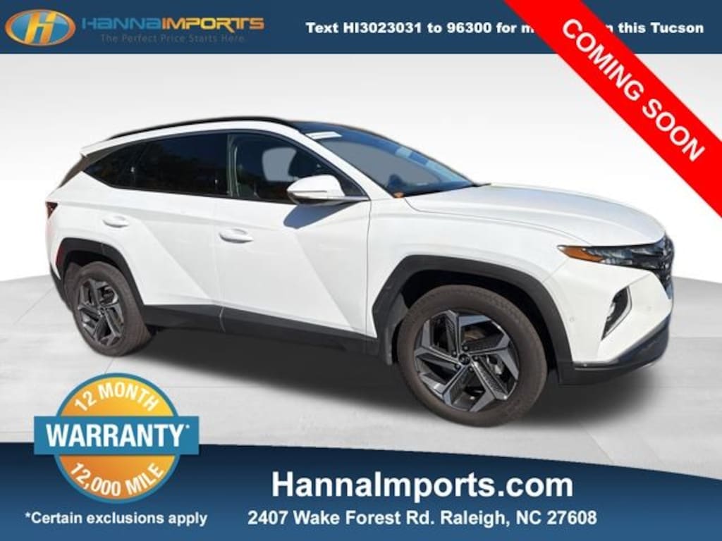 Why shop with Hanna Imports? We specialize in hand-selecting top-quality used cars, trucks, and SUVs for drivers across Raleigh, Durham, Cary, Chapel Hill, and the greater Triangle area of North Carolina. Our massive selection of 1,000+ vehicles on our Raleigh lot is carefully curated to include the most sought-after models, all priced below market value. We believe in transparency and efficiencyâ"our vehicles are aggressively priced from the start, which means no haggling, no hassle, and no wasted time. The price you see is our absolute best price. Whether you're coming from Wake Forest, Apex, Garner, or anywhere in central NC, weâre committed to making your car-buying experience smooth, affordable, and enjoyable. Come see why Hanna Imports is one of the most trusted used car dealerships in North Carolina! Used Hyundai Tucson in Raleigh. Used Hyundai Tucson in North Carolina, Option Group 01, Tucson Limited, AWD, Apple CarPlay & Android Auto, Heated & Ventilated Front Bucket Seats, Navigation System, Power Liftgate, Power moonroof, Remote keyless entry, 3.648 Axle Ratio, 4-Wheel Disc Brakes, 8 Speakers, ABS brakes, Air Conditioning, Alloy wheels, AM/FM radio: SiriusXM, Auto High-beam Headlights, Auto-dimming Rear-View mirror, Automatic temperature control, Brake assist, Bumpers: body-color, Cargo Tray, Carpeted Floor Mats, Delay-off headlights, Driver door bin, Driver vanity mirror, Dual front impact airbags, Dual front side impact airbags, Electronic Stability Control, Emergency communication system: Blue Link Connected Car Service (3-year complimentary subscription), First Aid Kit, Four wheel independent suspension, Front and Rear Mudguards, Front anti-roll bar, Front Bucket Seats, Front Center Armrest, Front dual zone A/C, Front reading lights, Fully automatic headlights, Garage door transmitter: HomeLink, Heated door mirrors, Heated front seats, Heated rear seats, Heated steering wheel, Illuminated entry, Leather Seat Trim, Low tire pressure warning, Memory seat, Occupant sensing airbag, Outside temperature display, Overhead airbag, Overhead console, Panic alarm, Passenger door bin, Passenger vanity mirror, Power door mirrors, Power driver seat, Power passenger seat, Power steering, Power windows, Radio data system, Radio: Bose Premium w/AM/FM/HD/SiriusXM Audio System, Rain sensing wipers, Rear anti-roll bar, Rear reading lights, Rear seat center armrest, Rear window defroster, Rear window wiper, Roof rack: rails only, Security system, Speed control, Split folding rear seat, Spoiler, Steering wheel mounted audio controls, Tachometer, Telescoping steering wheel, Tilt steering wheel, Traction control, Trip computer, Turn signal indicator mirrors, Variably intermittent wipers, Ventilated front seats, and Wheels: 19" x 7.5J" Machine-Face Finish Alloy.