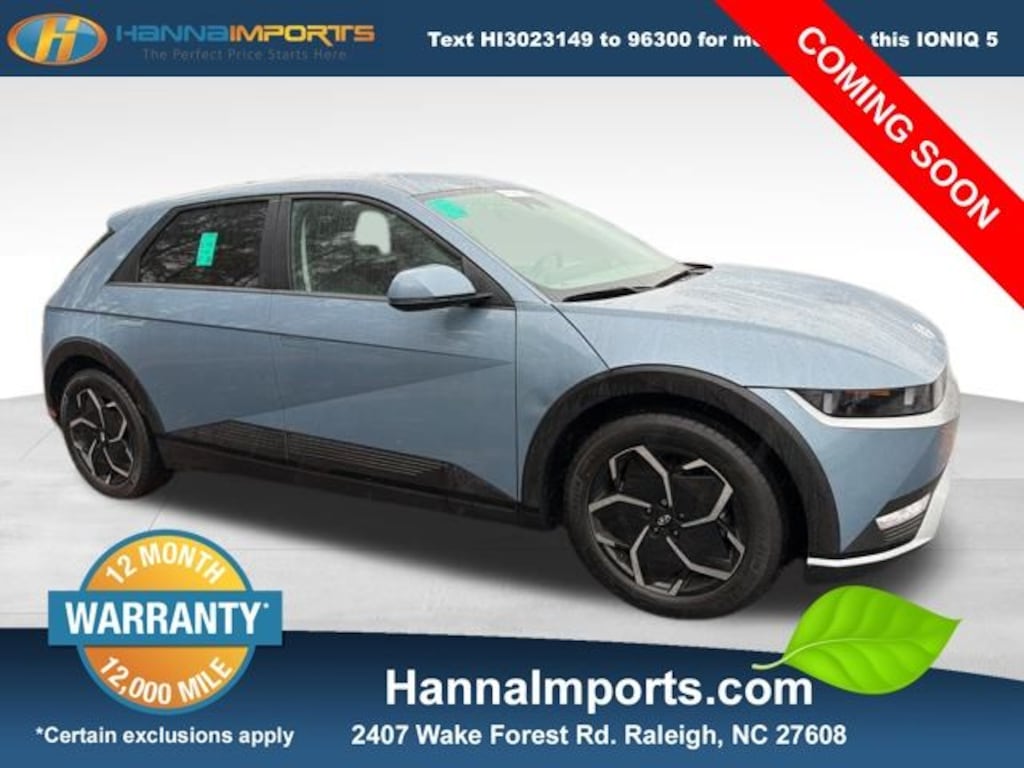 Why shop with Hanna Imports? We specialize in hand-selecting top-quality used cars, trucks, and SUVs for drivers across Raleigh, Durham, Cary, Chapel Hill, and the greater Triangle area of North Carolina. Our massive selection of 1,000+ vehicles on our Raleigh lot is carefully curated to include the most sought-after models, all priced below market value. We believe in transparency and efficiencyâ"our vehicles are aggressively priced from the start, which means no haggling, no hassle, and no wasted time. The price you see is our absolute best price. Whether you're coming from Wake Forest, Apex, Garner, or anywhere in central NC, weâre committed to making your car-buying experience smooth, affordable, and enjoyable. Come see why Hanna Imports is one of the most trusted used car dealerships in North Carolina! Used Hyundai IONIQ 5 in Raleigh. Used Hyundai IONIQ 5 in North Carolina, Option Group 01, IONIQ 5 SEL, Apple CarPlay & Android Auto, Navigation System, Power Liftgate, Remote keyless entry, 4-Wheel Disc Brakes, 4.71 Axle Ratio, 6 Speakers, ABS brakes, Air Conditioning, Alloy wheels, AM/FM radio: SiriusXM, Auto High-beam Headlights, Auto-dimming Rear-View mirror, Automatic temperature control, Bodyside moldings, Brake assist, Bumpers: body-color, Cargo Net, Carpeted Floor Mats, Charging Port Applique, Delay-off headlights, Driver door bin, Driver vanity mirror, Dual front impact airbags, Dual front side impact airbags, Electronic Stability Control, Emergency communication system: Bluelink+, First Aid Kit, Four wheel independent suspension, Front anti-roll bar, Front Bucket Seats, Front Center Armrest w/Storage, Front dual zone A/C, Front reading lights, Fully automatic headlights, Garage door transmitter: HomeLink, harman/kardon® Speakers, Heated door mirrors, Heated Front Bucket Seats, Heated front seats, Heated steering wheel, Illuminated entry, Leather steering wheel, Low tire pressure warning, Occupant sensing airbag, Outside temperature display, Overhead airbag, Overhead console, Panic alarm, Passenger door bin, Passenger vanity mirror, Power door mirrors, Power driver seat, Power steering, Power windows, Radio: AM/FM/SiriusXM/HD Display Audio System, Rear anti-roll bar, Rear reading lights, Rear side impact airbag, Rear window defroster, Security system, Speed control, Speed-sensing steering, Split folding rear seat, Spoiler, Stain-Resistant Cloth Seating Surfaces, Steering wheel mounted audio controls, Telescoping steering wheel, Tilt steering wheel, Traction control, Trip computer, Turn signal indicator mirrors, Variably intermittent wipers, Wheel Locks, and Wheels: 19" x 7.5J Aero Alloy.