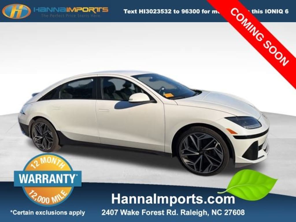 Why shop with Hanna Imports? We specialize in hand-selecting top-quality used cars, trucks, and SUVs for drivers across Raleigh, Durham, Cary, Chapel Hill, and the greater Triangle area of North Carolina. Our massive selection of 1,000+ vehicles on our Raleigh lot is carefully curated to include the most sought-after models, all priced below market value. We believe in transparency and efficiencyâ"our vehicles are aggressively priced from the start, which means no haggling, no hassle, and no wasted time. The price you see is our absolute best price. Whether you're coming from Wake Forest, Apex, Garner, or anywhere in central NC, weâre committed to making your car-buying experience smooth, affordable, and enjoyable. Come see why Hanna Imports is one of the most trusted used car dealerships in North Carolina! Used Hyundai IONIQ 6 in Raleigh. Used Hyundai IONIQ 6 in North Carolina, Option Group 01, IONIQ 6 SEL, Apple CarPlay & Android Auto, Navigation System, 4-Wheel Disc Brakes, 6 Speakers, ABS brakes, Air Conditioning, Alloy wheels, AM/FM radio: SiriusXM, Auto High-beam Headlights, Auto-dimming Rear-View mirror, Automatic temperature control, Brake assist, Bumpers: body-color, Carpeted Floor Mats, Delay-off headlights, Driver door bin, Driver vanity mirror, Dual front impact airbags, Dual front side impact airbags, Electronic Stability Control, Emergency communication system, Envelope Cargo Net, First Aid Kit, Four wheel independent suspension, Front anti-roll bar, Front Bucket Seats, Front Center Armrest, Front dual zone A/C, Front reading lights, Fully automatic headlights, Garage door transmitter: HomeLink, H-Tex Leatherette Seating Surfaces, harman/kardon® Speakers, Heated door mirrors, Heated Front Bucket Seats, Heated front seats, Illuminated entry, Leather steering wheel, Low tire pressure warning, Occupant sensing airbag, Outside temperature display, Overhead airbag, Panic alarm, Passenger door bin, Passenger vanity mirror, Power door mirrors, Power driver seat, Power steering, Power windows, Radio: AM/FM/SiriusXM/HD Radio Audio System, Rear anti-roll bar, Rear reading lights, Rear Reversible Cargo Tray, Rear seat center armrest, Rear window defroster, Remote keyless entry, Security system, Speed control, Speed-sensing steering, Split folding rear seat, Spoiler, Steering wheel mounted audio controls, Telescoping steering wheel, Tilt steering wheel, Traction control, Trip computer, Turn signal indicator mirrors, Variably intermittent wipers, Wheel Locks, and Wheels: 20 x 8.5J Alloy.