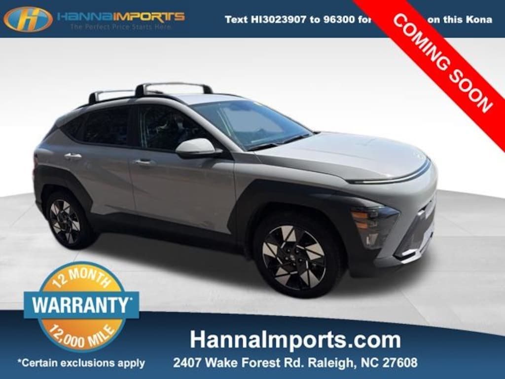 Why shop with Hanna Imports? We specialize in hand-selecting top-quality used cars, trucks, and SUVs for drivers across Raleigh, Durham, Cary, Chapel Hill, and the greater Triangle area of North Carolina. Our massive selection of 1,000+ vehicles on our Raleigh lot is carefully curated to include the most sought-after models, all priced below market value. We believe in transparency and efficiencyâ"our vehicles are aggressively priced from the start, which means no haggling, no hassle, and no wasted time. The price you see is our absolute best price. Whether you're coming from Wake Forest, Apex, Garner, or anywhere in central NC, weâre committed to making your car-buying experience smooth, affordable, and enjoyable. Come see why Hanna Imports is one of the most trusted used car dealerships in North Carolina! Used Hyundai Kona in Raleigh. Used Hyundai Kona in North Carolina, Option Group 01, Kona SEL, Apple CarPlay & Android Auto, Exterior Parking Camera Rear, Remote keyless entry, 4-Wheel Disc Brakes, 6 Speakers, 6.052 Axle Ratio, ABS brakes, Air Conditioning, Alloy wheels, AM/FM radio: SiriusXM, Auto High-beam Headlights, Automatic temperature control, Brake assist, Bumpers: body-color, Cargo Blocks, Cargo Net, Cargo Tray, Carpeted Floor Mats, Cloth Seat Trim, Cross Rails, Delay-off headlights, Driver door bin, Driver vanity mirror, Dual front impact airbags, Dual front side impact airbags, Electronic Stability Control, Emergency communication system: Bluelink+, First Aid Kit, Front anti-roll bar, Front Bucket Seats, Front Center Armrest, Front dual zone A/C, Front reading lights, Front wheel independent suspension, Fully automatic headlights, Heated door mirrors, Illuminated entry, Leather Shift Knob, Leather steering wheel, Low tire pressure warning, Occupant sensing airbag, Outside temperature display, Overhead airbag, Panic alarm, Passenger door bin, Passenger vanity mirror, Power door mirrors, Power driver seat, Power steering, Power windows, Radio: AM/FM/HD Radio/SiriusXM Audio System, Rear seat center armrest, Rear window defroster, Rear window wiper, Security system, Speed control, Speed-sensing steering, Split folding rear seat, Spoiler, Steering wheel mounted audio controls, Tachometer, Telescoping steering wheel, Tilt steering wheel, Traction control, Trip computer, Turn signal indicator mirrors, Variably intermittent wipers, and Wheels: 18" x 7.0J Glossy Black Alloy.