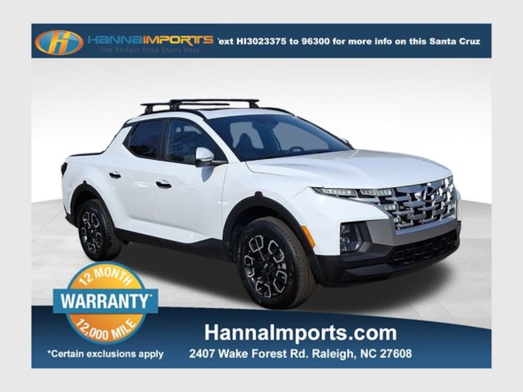 Why shop with Hanna Imports? We specialize in hand-selecting top-quality used cars, trucks, and SUVs for drivers across Raleigh, Durham, Cary, Chapel Hill, and the greater Triangle area of North Carolina. Our massive selection of 1,000+ vehicles on our Raleigh lot is carefully curated to include the most sought-after models, all priced below market value. We believe in transparency and efficiencyâ"our vehicles are aggressively priced from the start, which means no haggling, no hassle, and no wasted time. The price you see is our absolute best price. Whether you're coming from Wake Forest, Apex, Garner, or anywhere in central NC, weâre committed to making your car-buying experience smooth, affordable, and enjoyable. Come see why Hanna Imports is one of the most trusted used car dealerships in North Carolina! Used Hyundai Santa Cruz in Raleigh. Used Hyundai Santa Cruz in North Carolina, Activity Package (10.25" Digital Instrument Cluster, 115V AC Power Inverter in Bed, 15W Wireless Phone, Conventional Power Sunroof, Dual C-Channel Utility Tracks on Bed Side, Integrated Tonneau Cover, LED Bed Lighting, LED Front & Rear Interior Lights, Option Group 02, Radio: AM/FM/HD Audio System (P2), Rear Sliding Glass Window w/Defroster, and Roof Side Rails), Santa Cruz SEL, Apple CarPlay & Android Auto, Exterior Parking Camera Rear, 18" x 7.5J Alloy Wheels, 4-Wheel Disc Brakes, 4.081 Axle Ratio, 6 Speakers, ABS brakes, Air Conditioning, Alloy wheels, AM/FM radio: SiriusXM, Auto High-beam Headlights, Auto-leveling suspension, Automatic temperature control, Bed Cargo Net, Brake assist, Bumpers: body-color, Carpeted Floor Mats, Delay-off headlights, Driver door bin, Driver vanity mirror, Dual front impact airbags, Dual front side impact airbags, Electronic Stability Control, Emergency communication system: Bluelink+, First Aid Kit, Four wheel independent suspension, Front anti-roll bar, Front Bucket Seats, Front Center Armrest, Front dual zone A/C, Front reading lights, Fully automatic headlights, Heated door mirrors, Heated Front Bucket Seats, Heated front seats, Illuminated entry, Low tire pressure warning, Occupant sensing airbag, Outside temperature display, Overhead airbag, Overhead console, Panic alarm, Passenger door bin, Passenger vanity mirror, Power door mirrors, Power driver seat, Power steering, Power windows, Radio data system, Radio: AM/FM/HD Audio System, Rear anti-roll bar, Rear side impact airbag, Rear step bumper, Rear window defroster, Remote keyless entry, Roof Rack Cross Rails, Security system, Speed control, Speed-sensing steering, Split folding rear seat, Spoiler, Stain & Odor Resistant Cloth Seat Trim, Steering wheel mounted audio controls, Tachometer, Telescoping steering wheel, Tilt steering wheel, Traction control, Trip computer, Turn signal indicator mirrors, and Variably intermittent wipers.