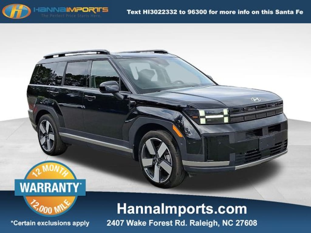 Why shop with Hanna Imports? We specialize in hand-selecting top-quality used cars, trucks, and SUVs for drivers across Raleigh, Durham, Cary, Chapel Hill, and the greater Triangle area of North Carolina. Our massive selection of 1,000+ vehicles on our Raleigh lot is carefully curated to include the most sought-after models, all priced below market value. We believe in transparency and efficiencyâ"our vehicles are aggressively priced from the start, which means no haggling, no hassle, and no wasted time. The price you see is our absolute best price. Whether you're coming from Wake Forest, Apex, Garner, or anywhere in central NC, weâre committed to making your car-buying experience smooth, affordable, and enjoyable. Come see why Hanna Imports is one of the most trusted used car dealerships in North Carolina! Used Hyundai Santa Fe in Raleigh. Used Hyundai Santa Fe in North Carolina, Option Group 01, Santa Fe Limited, Black Leather, 3rd row seats: bench, Apple CarPlay & Android Auto, Exterior Parking Camera Rear, Heated & Ventilated Front Bucket Seats, Navigation System, Power Liftgate, Power moonroof, 12 Speakers, 4-Wheel Disc Brakes, ABS brakes, Air Conditioning, Alloy wheels, AM/FM radio: SiriusXM, Auto High-beam Headlights, Auto-dimming Rear-View mirror, Automatic temperature control, Axle Ratio: 3.316, Brake assist, Bumpers: body-color, Cargo Blocks, Cargo Cover/Screen, Cargo Net, Carpeted Floor Mats, Delay-off headlights, Driver door bin, Driver vanity mirror, Dual front impact airbags, Dual front side impact airbags, Electronic Stability Control, Emergency communication system, First Aid Kit, Four wheel independent suspension, Front anti-roll bar, Front Bucket Seats, Front Center Armrest, Front dual zone A/C, Front reading lights, Fully automatic headlights, Garage door transmitter: HomeLink, Heated door mirrors, Heated front seats, Heated rear seats, Heated steering wheel, Illuminated entry, Knee airbag, Leather Seat Trim, Leather steering wheel, Low tire pressure warning, Memory seat, Mudguards, Occupant sensing airbag, Outside temperature display, Overhead airbag, Overhead console, Panic alarm, Passenger door bin, Passenger vanity mirror, Power door mirrors, Power driver seat, Power passenger seat, Power steering, Power windows, Radio: AM/FM/HD Bose Premium Audio System, Rain sensing wipers, Rear anti-roll bar, Rear seat center armrest, Rear side impact airbag, Rear window defroster, Rear window wiper, Remote keyless entry, Security system, Speed control, Speed-sensing steering, Split folding rear seat, Spoiler, Steering wheel mounted audio controls, Tachometer, Telescoping steering wheel, Tilt steering wheel, Tow Hitch, Traction control, Trip computer, Turn signal indicator mirrors, Variably intermittent wipers, Ventilated front seats, Wheel Locks, and Wheels: 20" x 8.5J Alloy.
