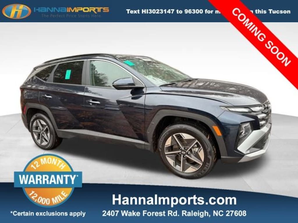 Why shop with Hanna Imports? We specialize in hand-selecting top-quality used cars, trucks, and SUVs for drivers across Raleigh, Durham, Cary, Chapel Hill, and the greater Triangle area of North Carolina. Our massive selection of 1,000+ vehicles on our Raleigh lot is carefully curated to include the most sought-after models, all priced below market value. We believe in transparency and efficiencyâ"our vehicles are aggressively priced from the start, which means no haggling, no hassle, and no wasted time. The price you see is our absolute best price. Whether you're coming from Wake Forest, Apex, Garner, or anywhere in central NC, weâre committed to making your car-buying experience smooth, affordable, and enjoyable. Come see why Hanna Imports is one of the most trusted used car dealerships in North Carolina! Used Hyundai Tucson Hybrid in Raleigh. Used Hyundai Tucson Hybrid in North Carolina, Option Group 01, Tucson Hybrid SEL Convenience, 1.6L I4 DGI Hybrid Turbocharged DOHC 16V LEV3-SULEV30, Apple CarPlay & Android Auto, Navigation System, Power Liftgate, Power moonroof, 18" Alloy Wheels, 4-Wheel Disc Brakes, 6 Speakers, ABS brakes, Air Conditioning, All Season Fitted Liners, Alloy wheels, AM/FM radio: SiriusXM, Auto High-beam Headlights, Auto-dimming Rear-View mirror, Automatic temperature control, Brake assist, Bumpers: body-color, Cargo Tray, Delay-off headlights, Driver door bin, Driver vanity mirror, Dual front impact airbags, Dual front side impact airbags, Electronic Stability Control, Emergency communication system: Bluelink+, First Aid Kit, Four wheel independent suspension, Front anti-roll bar, Front Bucket Seats, Front Center Armrest, Front dual zone A/C, Front reading lights, Fully automatic headlights, H-Tex Seat Trim, Heated door mirrors, Heated Front Bucket Seats, Heated front seats, Illuminated entry, Leather steering wheel, Low tire pressure warning, Mud Guards, Occupant sensing airbag, Outside temperature display, Overhead airbag, Overhead console, Panic alarm, Passenger door bin, Passenger vanity mirror, Power door mirrors, Power driver seat, Power steering, Power windows, Radio data system, Radio: AM/FM/HD Audio System, Rear anti-roll bar, Rear reading lights, Rear seat center armrest, Rear side impact airbag, Rear window defroster, Rear window wiper, Remote keyless entry, Security system, Speed control, Split folding rear seat, Spoiler, Steering wheel mounted audio controls, Tachometer, Telescoping steering wheel, Tilt steering wheel, Traction control, Trip computer, Turn signal indicator mirrors, and Variably intermittent wipers.