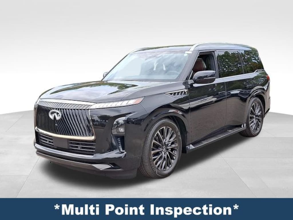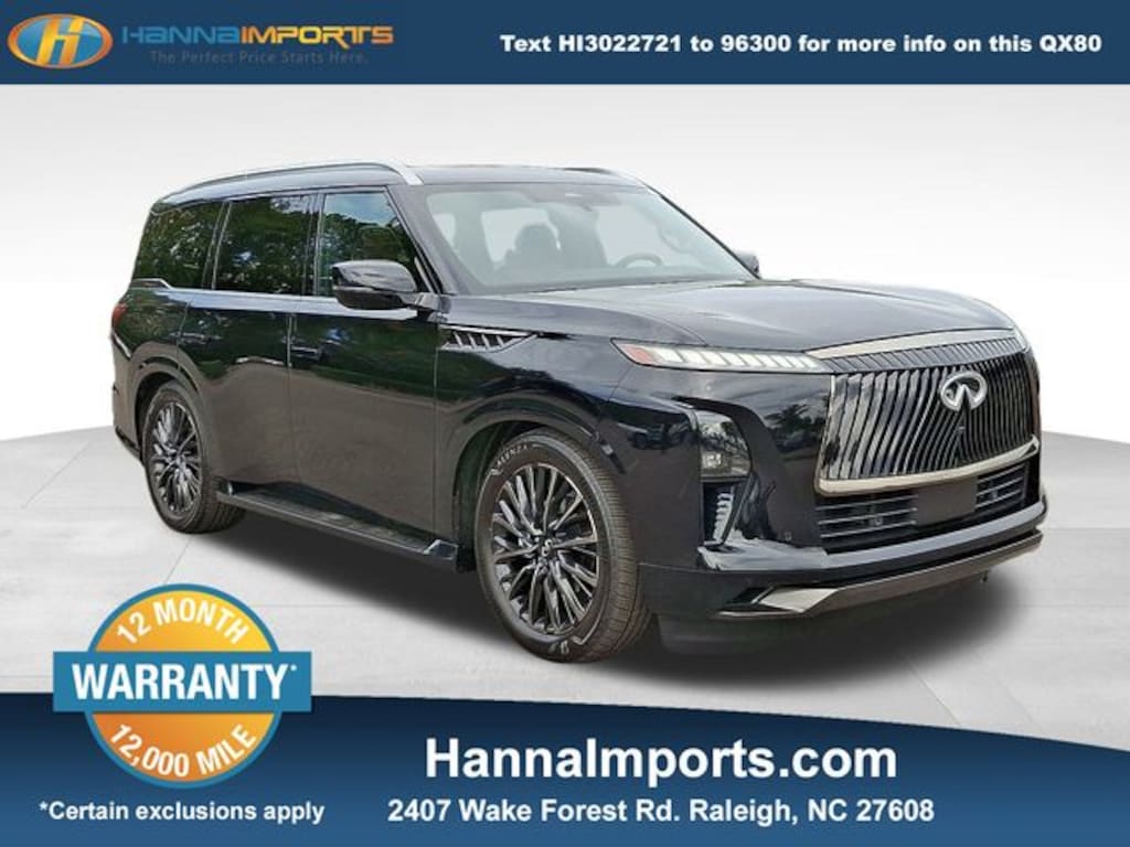Why shop with Hanna Imports? We specialize in hand-selecting top-quality used cars, trucks, and SUVs for drivers across Raleigh, Durham, Cary, Chapel Hill, and the greater Triangle area of North Carolina. Our massive selection of 1,000+ vehicles on our Raleigh lot is carefully curated to include the most sought-after models, all priced below market value. We believe in transparency and efficiencyâ"our vehicles are aggressively priced from the start, which means no haggling, no hassle, and no wasted time. The price you see is our absolute best price. Whether you're coming from Wake Forest, Apex, Garner, or anywhere in central NC, weâre committed to making your car-buying experience smooth, affordable, and enjoyable. Come see why Hanna Imports is one of the most trusted used car dealerships in North Carolina! Used INFINITI QX80 in Raleigh. Used INFINITI QX80 in North Carolina, Adaptive suspension, Apple CarPlay/Android Auto, Navigation system: Google Built-in, Power Liftgate, Power moonroof, Remote keyless entry, 3rd row seats: bench, 4-Wheel Disc Brakes, ABS brakes, Air Conditioning, Alloy wheels, AM/FM radio: SiriusXM with 360L, Anti-whiplash front head restraints, Audio memory, Auto High-beam Headlights, Auto tilt-away steering wheel, Auto-dimming door mirrors, Auto-dimming Rear-View mirror, Auto-leveling suspension, Automatic temperature control, Brake assist, Bumpers: body-color, Climate Controlled Front Bucket Seats w/Massage, Compass, Delay-off headlights, Driver door bin, Driver vanity mirror, Dual front impact airbags, Dual front side impact airbags, Electronic Stability Control, Emergency communication system: INFINITI InTouch, Four wheel independent suspension, Front anti-roll bar, Front Bucket Seats, Front Center Armrest, Front dual zone A/C, Front reading lights, Fully automatic headlights, Garage door transmitter: myQ Connected Garage, Genuine wood dashboard insert, Genuine wood door panel insert, Heads-Up Display, Heated door mirrors, Heated front seats, Heated rear seats, Heated steering wheel, HVAC memory, Illuminated entry, Knee airbag, Leather steering wheel, Low tire pressure warning, Memory seat, Occupant sensing airbag, Outside temperature display, Overhead airbag, Overhead console, Panic alarm, Passenger door bin, Passenger vanity mirror, Power door mirrors, Power driver seat, Power passenger seat, Power steering, Power windows, Radio data system, Radio: Klipsch Reference Premiere Audio System, Rain sensing wipers, Rear air conditioning, Rear anti-roll bar, Rear reading lights, Rear seat center armrest, Rear window defroster, Rear window wiper, Reclining 3rd row seat, Security system, Semi-Aniline Premium Leather Seating Surfaces, Speed control, Speed-sensing steering, Split folding rear seat, Spoiler, Steering wheel memory, Steering wheel mounted audio controls, Tachometer, Telescoping steering wheel, Tilt steering wheel, Traction control, Trip computer, Turn signal indicator mirrors, Variably intermittent wipers, Ventilated front seats, Ventilated rear seats, and Wheels: 22" x 8" Cast Aluminum Alloy.