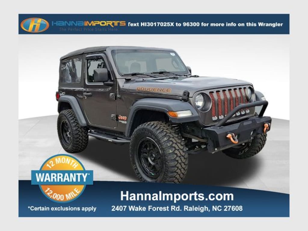 Why shop with Hanna Imports? We specialize in hand-selecting top-quality used cars, trucks, and SUVs for drivers across Raleigh, Durham, Cary, Chapel Hill, and the greater Triangle area of North Carolina. Our massive selection of 1,000+ vehicles on our Raleigh lot is carefully curated to include the most sought-after models, all priced below market value. We believe in transparency and efficiencyâ"our vehicles are aggressively priced from the start, which means no haggling, no hassle, and no wasted time. The price you see is our absolute best price. Whether you're coming from Wake Forest, Apex, Garner, or anywhere in central NC, weâre committed to making your car-buying experience smooth, affordable, and enjoyable. Come see why Hanna Imports is one of the most trusted used car dealerships in North Carolina! Used Jeep Wrangler in Raleigh. Used Jeep Wrangler in North Carolina, Quick Order Package 28B, Wrangler Sport, 3.45 Rear Axle Ratio, 4-Wheel Disc Brakes, 8 Speakers, ABS brakes, Air Conditioning, AM/FM radio, Brake assist, Cloth Low-Back Bucket Seats, Compass, Delay-off headlights, Driver door bin, Driver vanity mirror, Dual front impact airbags, Dual front side impact airbags, Electronic Stability Control, Front anti-roll bar, Front Bucket Seats, Front Center Armrest w/Storage, Front fog lights, Front reading lights, Integrated roll-over protection, Low tire pressure warning, Manufacturer's Statement of Origin (DISC), MOPAR All-Weather Floor Mats, Non-Lock Fuel Cap w/o Discriminator, Normal Duty Suspension, Occupant sensing airbag, Outside temperature display, ParkView Rear Back-Up Camera, Passenger door bin, Passenger vanity mirror, Power steering, Radio data system, Radio: Uconnect 3 w/5" Display, Rear anti-roll bar, Rear reading lights, Speed control, Steering wheel mounted audio controls, Tachometer, Telescoping steering wheel, Tilt steering wheel, Traction control, Trip computer, Variably intermittent wipers, and Wheels: 17" x 7.5" Black Steel Styled.