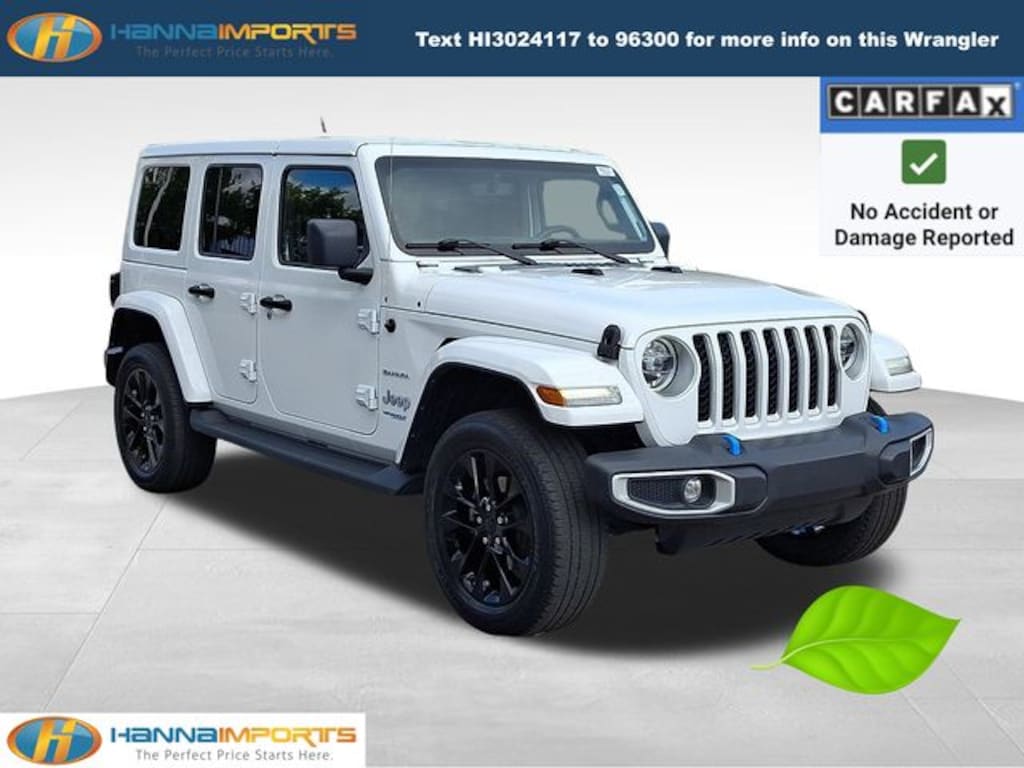Why shop with Hanna Imports? We specialize in hand-selecting top-quality used cars, trucks, and SUVs for drivers across Raleigh, Durham, Cary, Chapel Hill, and the greater Triangle area of North Carolina. Our massive selection of 1,000+ vehicles on our Raleigh lot is carefully curated to include the most sought-after models, all priced below market value. We believe in transparency and efficiencyâ"our vehicles are aggressively priced from the start, which means no haggling, no hassle, and no wasted time. The price you see is our absolute best price. Whether you're coming from Wake Forest, Apex, Garner, or anywhere in central NC, weâre committed to making your car-buying experience smooth, affordable, and enjoyable. Come see why Hanna Imports is one of the most trusted used car dealerships in North Carolina! Used Jeep Wrangler in Raleigh. Used Jeep Wrangler in North Carolina, Cold Weather Group (Heated Front Seats, Heated Steering Wheel, and Remote Start System), Quick Order Package 29P, Wrangler Unlimited Sahara 4xe, 2.0L I4 DOHC, Apple CarPlay/Android Auto, Body Color 3-Piece Hard Top, Freedom Panel Storage Bag, Navigation System, ParkView Rear Back-Up Camera, Rear Window Defroster, Rear Window Wiper/Washer, 3.73 Rear Axle Ratio, 4-Wheel Disc Brakes, 9 Speakers, ABS brakes, Air Conditioning, Alloy wheels, AM/FM radio, Auto-dimming Rear-View mirror, Automatic temperature control, Brake assist, Compass, Corning Gorilla Glass, Delay-off headlights, Driver door bin, Driver vanity mirror, Dual front impact airbags, Dual front side impact airbags, Electronic Stability Control, Emergency communication system: SiriusXM Guardian, Front anti-roll bar, Front Bucket Seats, Front Center Armrest w/Storage, Front dual zone A/C, Front fog lights, Front reading lights, Fully automatic headlights, Garage door transmitter, Heated door mirrors, Illuminated entry, Integrated roll-over protection, Leather Shift Knob, Leather steering wheel, Low tire pressure warning, MOPAR All-Weather Floor Mats, Occupant sensing airbag, Outside temperature display, Panic alarm, Passenger door bin, Passenger vanity mirror, Power door mirrors, Power steering, Power windows, Premium McKinley Trimmed Seats, Radio data system, Radio: Uconnect 4C Nav w/8.4" Display, Rear anti-roll bar, Rear reading lights, Rear seat center armrest, Remote keyless entry, Security system, Speed control, Split folding rear seat, Sport Suspension, Steering wheel mounted audio controls, Tachometer, Telescoping steering wheel, Tilt steering wheel, Traction control, Trip computer, Variably intermittent wipers, Voltmeter, and Wheels: 20" x 8" Fully Painted Aluminum.