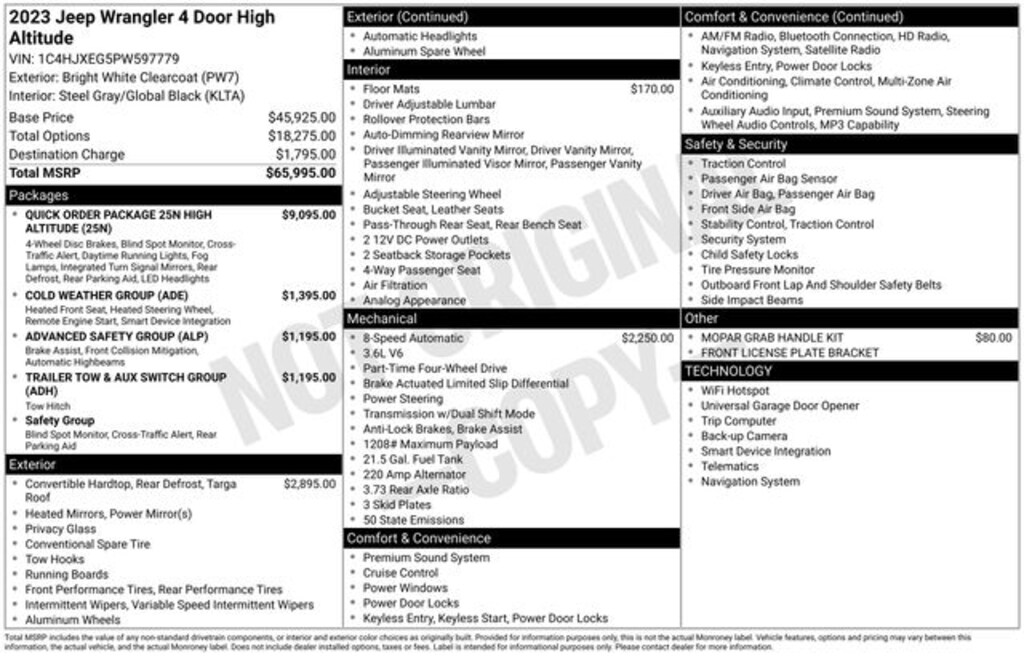 Why shop with Hanna Imports? We specialize in hand-selecting top-quality used cars, trucks, and SUVs for drivers across Raleigh, Durham, Cary, Chapel Hill, and the greater Triangle area of North Carolina. Our massive selection of 1,000+ vehicles on our Raleigh lot is carefully curated to include the most sought-after models, all priced below market value. We believe in transparency and efficiencyâ"our vehicles are aggressively priced from the start, which means no haggling, no hassle, and no wasted time. The price you see is our absolute best price. Whether you're coming from Wake Forest, Apex, Garner, or anywhere in central NC, weâre committed to making your car-buying experience smooth, affordable, and enjoyable. Come see why Hanna Imports is one of the most trusted used car dealerships in North Carolina! Used Jeep Wrangler in Raleigh. Used Jeep Wrangler in North Carolina, Advanced Safety Group (Advanced Brake Assist, Auto High Beam Headlamp Control, and Full Speed Forward Collision Warning Plus), Cold Weather Group (Heated Front Seats, Heated Steering Wheel, and Remote Start System), High Altitude Package, LED Lighting Group (Daytime Running Lamps LED Accents, Front LED Fog Lamps, LED Premium Reflector Headlamps, and LED Taillamps), MOPAR Grab Handle Kit (Front MOPAR Grab Handles and Rear MOPAR Grab Handles), Quick Order Package 25N High Altitude (Anti-Lock 4-Wheel FNC Disc Brakes, Body Color 3-Piece Hard Top, Body Color Door Handles, Body Color Front Bumper, Body Color Fuel Filler Door, Body Color Grille w/Gloss Black Rings, Body Color Rear Bumper w/Step Pads, Caramel Interior Accents, Dana M210 Wide HD Tube Front Axle, Dana M220 Wide Rear Axle, Exterior Mirrors w/Supplemental Signals, Freedom Panel Storage Bag, Full Body Color Fender Flares, Gray/Black Trail Rated Badge, High Altitude Badging, Leather Wrapped Park Brake Handle, Leather Wrapped Shift Knob, Matte Black Jeep Badge, Nappa Leather Seats, No Soft Top, Premium Dark Exterior Accents, Rear Window Defroster, Rear Window Wiper/Washer, Side Steps, Sport Suspension, Wheels: 20" x 8" Fully Painted Aluminum, and Wrapped I/P Bezel w/Caramel Stitch), Safety Group (Blind Spot & Cross Path Detection and ParkSense Rear Park Assist System), Trailer Tow & Aux Switch Group (240 Amp Alternator, 7 & 4 Pin Wiring Harness, 700 Amp Maintenance Free Battery, Auxiliary Switches, and Class II Receiver Hitch), 4-Wheel Disc Brakes, 9 Speakers, ABS brakes, Air Conditioning, Alloy wheels, AM/FM radio: SiriusXM, Apple CarPlay/Android Auto, Auto-dimming Rear-View mirror, Automatic temperature control, Aux Battery, Brake assist, Cloth Low-Back Bucket Seats, Compass, Delay-off headlights, Driver door bin, Driver vanity mirror, Dual front impact airbags, Dual front side impact airbags, Electronic Stability Control, Emergency communication system: SiriusXM Guardian, Front anti-roll bar, Front Bucket Seats, Front Center Armrest w/Storage, Front dual zone A/C, Front fog lights, Front License Plate Bracket, Front reading lights, Fully automatic headlights, Garage door transmitter, Heated door mirrors, Heavy Duty Suspension w/Gas Shocks, Illuminated entry, Integrated roll-over protection, Low tire pressure warning, MOPAR All-Weather Floor Mats, Navigation System, Non-Lock Fuel Cap w/o Discriminator, Occupant sensing airbag, Outside temperature display, Panic alarm, ParkView Rear Back-Up Camera, Passenger door bin, Passenger vanity mirror, Power door mirrors, Power steering, Power windows, Radio data system, Radio: Uconnect 4C Nav w/8.4" Display, Rear anti-roll bar, Rear reading lights, Remote keyless entry, Security system, Speed control, Split folding rear seat, Steering wheel mounted audio controls, Stop-Start Dual Battery System, Tachometer, Telescoping steering wheel, Tilt steering wheel, Traction control, Trip computer, Variably intermittent wipers, Voltmeter, and Wheels: 18" x 7.5" Machined w/Gray Spokes.