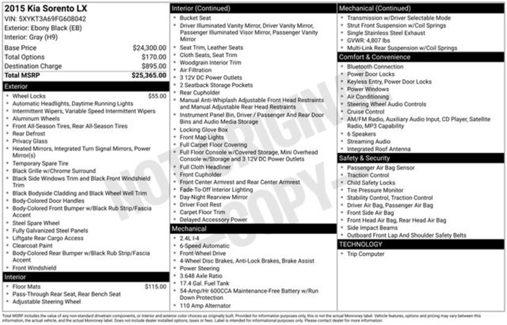 2015 Kia Sorento LX Ebony Black 20/27 City/Highway MPG