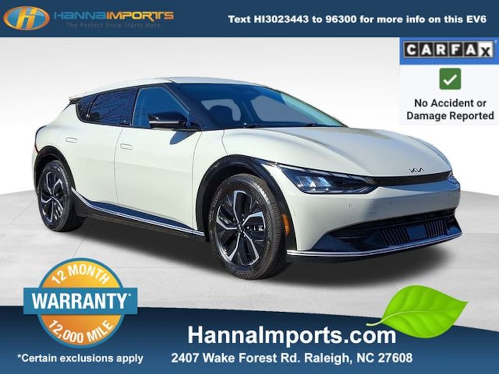 Why shop with Hanna Imports? We specialize in hand-selecting top-quality used cars, trucks, and SUVs for drivers across Raleigh, Durham, Cary, Chapel Hill, and the greater Triangle area of North Carolina. Our massive selection of 1,000+ vehicles on our Raleigh lot is carefully curated to include the most sought-after models, all priced below market value. We believe in transparency and efficiencyâ"our vehicles are aggressively priced from the start, which means no haggling, no hassle, and no wasted time. The price you see is our absolute best price. Whether you're coming from Wake Forest, Apex, Garner, or anywhere in central NC, weâre committed to making your car-buying experience smooth, affordable, and enjoyable. Come see why Hanna Imports is one of the most trusted used car dealerships in North Carolina! Used Kia EV6 in Raleigh. Used Kia EV6 in North Carolina, EV6 Wind, AWD, Glacier, Apple CarPlay & Android Auto, Heated front seats, Heated rear seats, Navigation system: AVN 5.0 Navigation System, Power Liftgate, Remote keyless entry, Smart Key w/ Push Button and Remote Start, 14 Speakers, 4-Wheel Disc Brakes, ABS brakes, Air Conditioning, Alloy wheels, AM/FM radio: SiriusXM, Auto High-beam Headlights, Auto-dimming Rear-View mirror, Automatic temperature control, Axle Ratio: 10.650, Brake assist, Bumpers: body-color, Carpeted Floor Mats, Delay-off headlights, Driver door bin, Driver vanity mirror, Dual front impact airbags, Dual front side impact airbags, Electronic Stability Control, Emergency communication system, Four wheel independent suspension, Front anti-roll bar, Front Bucket Seats, Front Center Armrest, Front dual zone A/C, Front reading lights, Fully automatic headlights, Heated & Ventilated Front Bucket Seats, Heated door mirrors, Heated steering wheel, Illuminated Door Sill Plates, Illuminated entry, Knee airbag, Low tire pressure warning, Memory seat, Occupant sensing airbag, Outside temperature display, Overhead airbag, Overhead console, Panic alarm, Passenger door bin, Passenger vanity mirror, Power door mirrors, Power driver seat, Power passenger seat, Power steering, Power windows, Radio: Meridian Premium Audio System, Rain sensing wipers, Rear anti-roll bar, Rear seat center armrest, Rear window defroster, Security system, Speed control, Speed-sensing steering, Split folding rear seat, Spoiler, Steering wheel mounted audio controls, Telescoping steering wheel, Tilt steering wheel, Tow Hitch, Traction control, Trip computer, Turn signal indicator mirrors, Variably intermittent wipers, Vegan Leather Seat Trim, Ventilated front seats, and Wheels: 7.5J x 19" Black Painted Alloy.