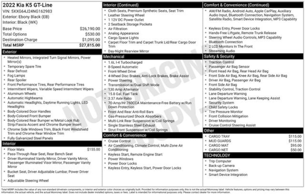 2022 Kia K5 GT-Line Ebony Black 27/37 City/Highway MPG