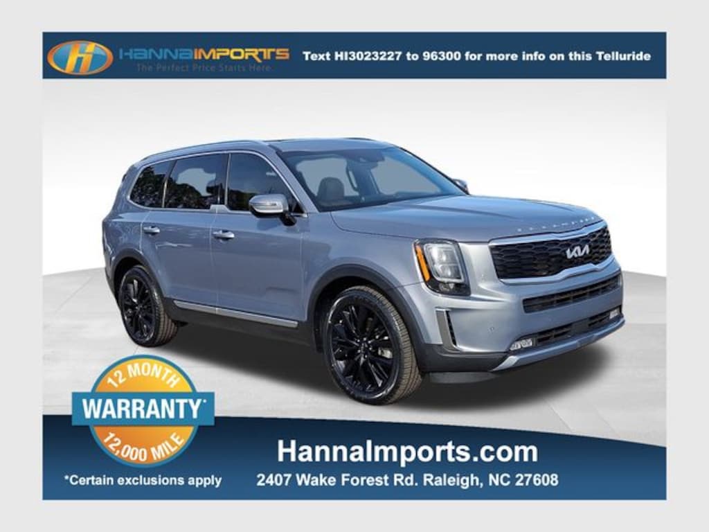 Why shop with Hanna Imports? We specialize in hand-selecting top-quality used cars, trucks, and SUVs for drivers across Raleigh, Durham, Cary, Chapel Hill, and the greater Triangle area of North Carolina. Our massive selection of 1,000+ vehicles on our Raleigh lot is carefully curated to include the most sought-after models, all priced below market value. We believe in transparency and efficiencyâ"our vehicles are aggressively priced from the start, which means no haggling, no hassle, and no wasted time. The price you see is our absolute best price. Whether you're coming from Wake Forest, Apex, Garner, or anywhere in central NC, weâre committed to making your car-buying experience smooth, affordable, and enjoyable. Come see why Hanna Imports is one of the most trusted used car dealerships in North Carolina! Used Kia Telluride in Raleigh. Used Kia Telluride in North Carolina, Telluride SX, Apple CarPlay & Android Auto, Navigation System, Power moonroof, Rear Seat Entertainment System, 10 Speakers, 3.648 Axle Ratio, 3rd row seats: split-bench, 4-Wheel Disc Brakes, ABS brakes, Air Conditioning, Alloy wheels, AM/FM radio: SiriusXM, Auto High-beam Headlights, Auto-dimming Rear-View mirror, Automatic temperature control, Brake assist, Bumpers: body-color, Compass, Delay-off headlights, Driver door bin, Driver vanity mirror, Dual front impact airbags, Dual front side impact airbags, Electronic Stability Control, Emergency communication system: 911 Connect, Folding Cargo Tray, Four wheel independent suspension, Front anti-roll bar, Front Bucket Seats, Front Center Armrest, Front dual zone A/C, Front fog lights, Front reading lights, Fully automatic headlights, Garage door transmitter: HomeLink, harman/kardon® Speakers, Heated & Ventilated Front Bucket Seats, Heated door mirrors, Heated front seats, Illuminated entry, Knee airbag, Leather Seat Trim, Leather Shift Knob, Leather steering wheel, Low tire pressure warning, Memory seat, Occupant sensing airbag, Outside temperature display, Overhead airbag, Overhead console, Panic alarm, Passenger door bin, Passenger vanity mirror, Power door mirrors, Power driver seat, Power Liftgate, Power passenger seat, Power steering, Power windows, Radio data system, Radio: AM/FM harman/kardon Audio System, Rear air conditioning, Rear anti-roll bar, Rear audio controls, Rear reading lights, Rear window defroster, Rear window wiper, Reclining 3rd row seat, Remote keyless entry, Roof rack: rails only, Security system, Smart Key w/ Push Button and Remote Start, Speed control, Speed-sensing steering, Split folding rear seat, Spoiler, Steering wheel mounted audio controls, Tachometer, Telescoping steering wheel, Tilt steering wheel, Traction control, Trip computer, Turn signal indicator mirrors, Variably intermittent wipers, Ventilated front seats, and Wheels: 20" x 7.5" Black Alloy.