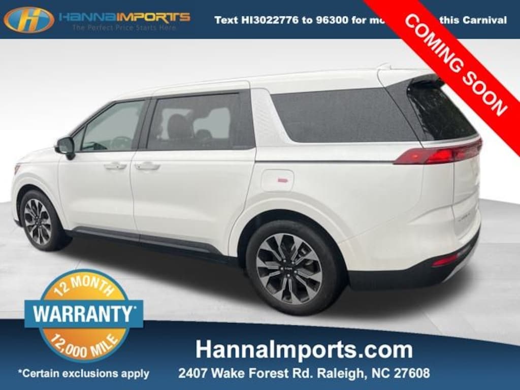 Why shop with Hanna Imports? We specialize in hand-selecting top-quality used cars, trucks, and SUVs for drivers across Raleigh, Durham, Cary, Chapel Hill, and the greater Triangle area of North Carolina. Our massive selection of 1,000+ vehicles on our Raleigh lot is carefully curated to include the most sought-after models, all priced below market value. We believe in transparency and efficiencyâ€"our vehicles are aggressively priced from the start, which means no haggling, no hassle, and no wasted time. The price you see is our absolute best price. Whether you're coming from Wake Forest, Apex, Garner, or anywhere in central NC, we’re committed to making your car-buying experience smooth, affordable, and enjoyable. Come see why Hanna Imports is one of the most trusted used car dealerships in North Carolina! Used Kia Carnival in Raleigh. Used Kia Carnival in North Carolina, Carnival EX, Snow White Pearl, Apple CarPlay & Android Auto, Heated front seats, Navigation System, Remote keyless entry, 10 Speakers, 3.51 Axle Ratio, 3rd row seats: split-bench, 4-Wheel Disc Brakes, ABS brakes, Air Conditioning, Alloy wheels, AM/FM radio: SiriusXM, Artificial Leather Seat Trim, Auto High-beam Headlights, Automatic temperature control, Brake assist, Bumpers: body-color, Compass, Delay-off headlights, Driver door bin, Driver vanity mirror, Dual front impact airbags, Dual front side impact airbags, Electronic Stability Control, Emergency communication system, Four wheel independent suspension, Front anti-roll bar, Front Bucket Seats, Front Center Armrest, Front dual zone A/C, Front reading lights, Fully automatic headlights, Heated door mirrors, Heated Front Bucket Seats, Illuminated entry, Knee airbag, Leather Shift Knob, Leather steering wheel, Low tire pressure warning, Occupant sensing airbag, Outside temperature display, Overhead airbag, Overhead console, Panic alarm, Passenger door bin, Passenger vanity mirror, Power door mirrors, Power driver seat, Power steering, Power windows, Radio: AM/FM/HD Audio System, Rear air conditioning, Rear anti-roll bar, Rear reading lights, Rear window defroster, Rear window wiper, Reclining 3rd row seat, Security system, Speed control, Speed-sensing steering, Split folding rear seat, Spoiler, Steering wheel mounted audio controls, Tachometer, Telescoping steering wheel, Tilt steering wheel, Traction control, Trip computer, Turn signal indicator mirrors, Variably intermittent wipers, Wheel Locks, and Wheels: 7.5J x 19" Machine-Finished Alloy.