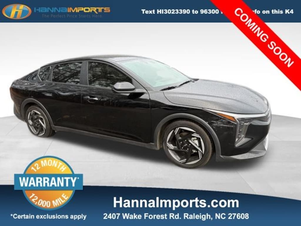 Why shop with Hanna Imports? We specialize in hand-selecting top-quality used cars, trucks, and SUVs for drivers across Raleigh, Durham, Cary, Chapel Hill, and the greater Triangle area of North Carolina. Our massive selection of 1,000+ vehicles on our Raleigh lot is carefully curated to include the most sought-after models, all priced below market value. We believe in transparency and efficiencyâ"our vehicles are aggressively priced from the start, which means no haggling, no hassle, and no wasted time. The price you see is our absolute best price. Whether you're coming from Wake Forest, Apex, Garner, or anywhere in central NC, weâre committed to making your car-buying experience smooth, affordable, and enjoyable. Come see why Hanna Imports is one of the most trusted used car dealerships in North Carolina! Used Kia K4 in Raleigh. Used Kia K4 in North Carolina, K4 EX, Apple CarPlay & Android Auto, Remote keyless entry, 4-Wheel Disc Brakes, 6 Speakers, ABS brakes, Air Conditioning, Alloy wheels, AM/FM radio: SiriusXM, Auto High-beam Headlights, Automatic temperature control, Brake assist, Bumpers: body-color, Carpeted Floor Mats, Delay-off headlights, Driver door bin, Driver vanity mirror, Dual front impact airbags, Dual front side impact airbags, Electronic Stability Control, Front anti-roll bar, Front Bucket Seats, Front Center Armrest, Front dual zone A/C, Front reading lights, Front wheel independent suspension, Fully automatic headlights, Heated door mirrors, Illuminated entry, Low tire pressure warning, Occupant sensing airbag, Outside temperature display, Overhead airbag, Overhead console, Panic alarm, Passenger door bin, Passenger vanity mirror, Power door mirrors, Power steering, Power windows, Radio data system, Radio: 12.3" Touchscreen Audio Display, Rear side impact airbag, Rear window defroster, Security system, Speed control, Split folding rear seat, Steering wheel mounted audio controls, Tachometer, Telescoping steering wheel, Tilt steering wheel, Traction control, Trip computer, Upgraded Cloth Seat Trim, Variably intermittent wipers, and Wheels: 17" x 7.0J Black Machined Alloy.
