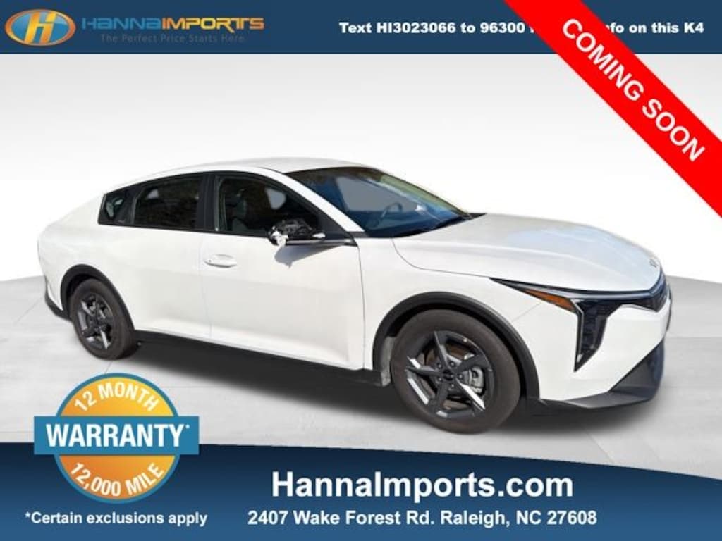 Why shop with Hanna Imports? We specialize in hand-selecting top-quality used cars, trucks, and SUVs for drivers across Raleigh, Durham, Cary, Chapel Hill, and the greater Triangle area of North Carolina. Our massive selection of 1,000+ vehicles on our Raleigh lot is carefully curated to include the most sought-after models, all priced below market value. We believe in transparency and efficiencyâ"our vehicles are aggressively priced from the start, which means no haggling, no hassle, and no wasted time. The price you see is our absolute best price. Whether you're coming from Wake Forest, Apex, Garner, or anywhere in central NC, weâre committed to making your car-buying experience smooth, affordable, and enjoyable. Come see why Hanna Imports is one of the most trusted used car dealerships in North Carolina! Used Kia K4 in Raleigh. Used Kia K4 in North Carolina, K4 LXS, Remote keyless entry, 4-Wheel Disc Brakes, 6 Speakers, ABS brakes, Air Conditioning, Alloy wheels, AM/FM radio: SiriusXM, Apple CarPlay & Android Auto, Auto High-beam Headlights, Brake assist, Bumpers: body-color, Carpeted Floor Mats, Chrome Wheel Locks, Cloth Seat Trim, Delay-off headlights, Driver door bin, Driver vanity mirror, Dual front impact airbags, Dual front side impact airbags, Electronic Stability Control, Front anti-roll bar, Front Bucket Seats, Front Center Armrest, Front reading lights, Front wheel independent suspension, Fully automatic headlights, Heated door mirrors, Illuminated entry, Low tire pressure warning, Occupant sensing airbag, Outside temperature display, Overhead airbag, Overhead console, Panic alarm, Passenger door bin, Passenger vanity mirror, Power door mirrors, Power steering, Power windows, Radio data system, Radio: 12.3" Touchscreen Audio Display, Rear side impact airbag, Rear window defroster, Security system, Speed control, Split folding rear seat, Steering wheel mounted audio controls, Tachometer, Telescoping steering wheel, Tilt steering wheel, Traction control, Trip computer, Variably intermittent wipers, and Wheels: 16" x 6.5J Dark Gray Alloy.