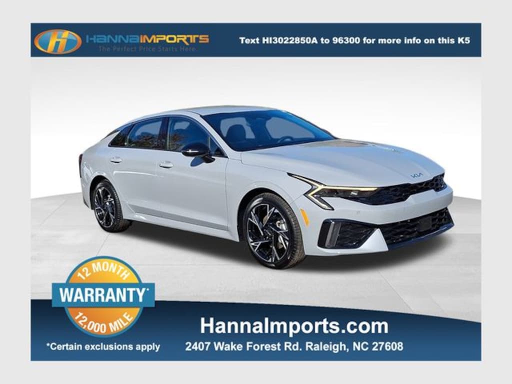 Why shop with Hanna Imports? We specialize in hand-selecting top-quality used cars, trucks, and SUVs for drivers across Raleigh, Durham, Cary, Chapel Hill, and the greater Triangle area of North Carolina. Our massive selection of 1,000+ vehicles on our Raleigh lot is carefully curated to include the most sought-after models, all priced below market value. We believe in transparency and efficiencyâ"our vehicles are aggressively priced from the start, which means no haggling, no hassle, and no wasted time. The price you see is our absolute best price. Whether you're coming from Wake Forest, Apex, Garner, or anywhere in central NC, weâre committed to making your car-buying experience smooth, affordable, and enjoyable. Come see why Hanna Imports is one of the most trusted used car dealerships in North Carolina! Used Kia K5 in Raleigh. Used Kia K5 in North Carolina, K5 GT-Line, Heated Front Bucket Seats, Navigation System, Remote keyless entry, 4-Wheel Disc Brakes, 6 Speakers, ABS brakes, Air Conditioning, Alloy wheels, AM/FM radio: SiriusXM, Auto High-beam Headlights, Automatic temperature control, Brake assist, Bumpers: body-color, Carpeted Floor Mats, Delay-off headlights, Driver door bin, Driver vanity mirror, Dual front impact airbags, Dual front side impact airbags, Electronic Stability Control, Emergency communication system: Kia Connect (includes 1 year free trial), Four wheel independent suspension, Front anti-roll bar, Front Bucket Seats, Front Center Armrest, Front dual zone A/C, Front fog lights, Front reading lights, Fully automatic headlights, Heated door mirrors, Heated front seats, Heated steering wheel, Illuminated entry, Knee airbag, Leather Shift Knob, Leather steering wheel, Low tire pressure warning, Occupant sensing airbag, Outside temperature display, Overhead airbag, Overhead console, Panic alarm, Passenger door bin, Passenger vanity mirror, Power door mirrors, Power driver seat, Power steering, Power windows, Radio data system, Radio: AM/FM Audio System, Rear anti-roll bar, Rear seat center armrest, Rear side impact airbag, Rear window defroster, Security system, Speed control, Speed-sensing steering, Split folding rear seat, Sport steering wheel, Steering wheel mounted audio controls, Tachometer, Telescoping steering wheel, Tilt steering wheel, Traction control, Trip computer, Turn signal indicator mirrors, Variably intermittent wipers, and Wheels: 18" x 7.5J Gloss Black Machined Finish Alloy.
