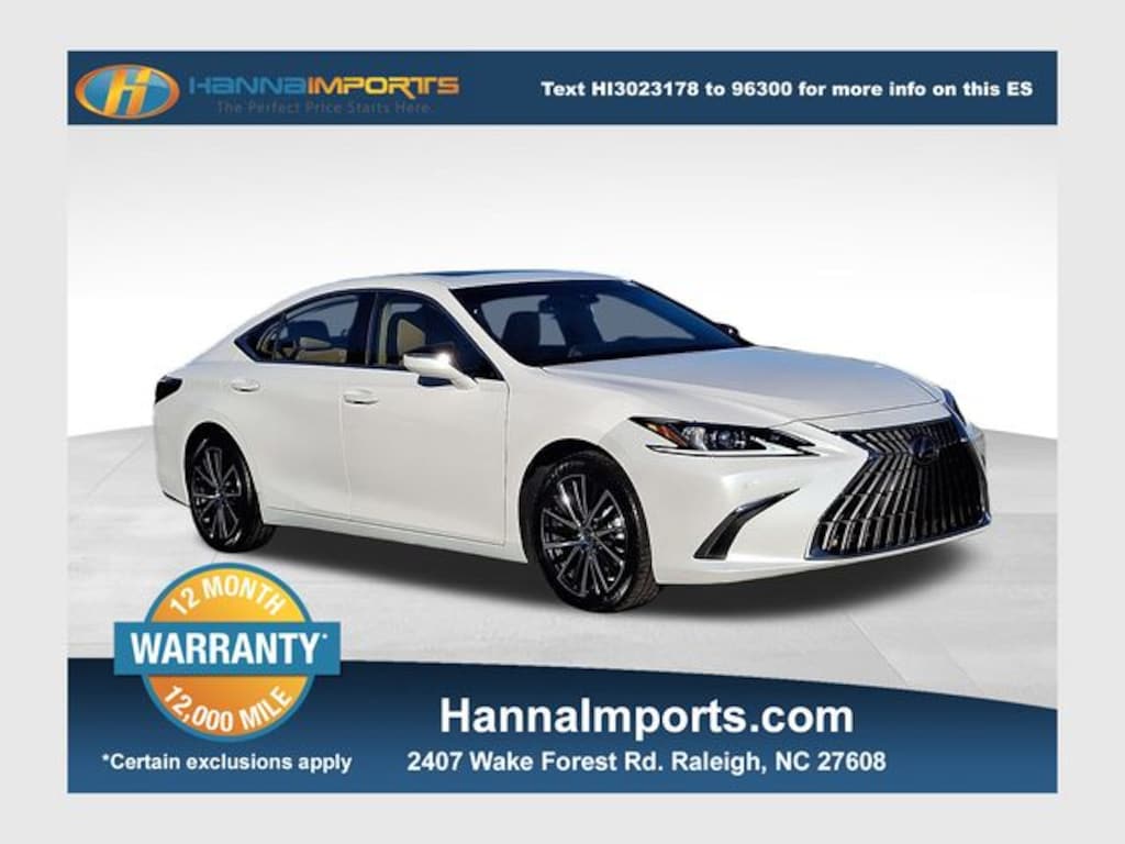Why shop with Hanna Imports? We specialize in hand-selecting top-quality used cars, trucks, and SUVs for drivers across Raleigh, Durham, Cary, Chapel Hill, and the greater Triangle area of North Carolina. Our massive selection of 1,000+ vehicles on our Raleigh lot is carefully curated to include the most sought-after models, all priced below market value. We believe in transparency and efficiencyâ"our vehicles are aggressively priced from the start, which means no haggling, no hassle, and no wasted time. The price you see is our absolute best price. Whether you're coming from Wake Forest, Apex, Garner, or anywhere in central NC, weâre committed to making your car-buying experience smooth, affordable, and enjoyable. Come see why Hanna Imports is one of the most trusted used car dealerships in North Carolina! Used Lexus ES in Raleigh. Used Lexus ES in North Carolina, Premium Package (Heated & Ventilated Seats, Heated Leather 3-Spoke Steering Wheel, Intuitive Parking Assist w/Auto Braking, Parking Support Alert/Brake, Perforated NuLuxe Seat Trim (LD), Power Tilt/Telescoping Steering Wheel w/Memory, Power-Folding Outside Mirrors w/Memory, Rain Sensing Wipers, Windshield De-Icer, and Wireless Charger), Black w/Wood Black Trim w/Perforated NuLuxe Seat Trim, Exterior Parking Camera Rear, Power moonroof, 10 Speakers, 10-Way Power Adjustable Front Seats, 4-Wheel Disc Brakes, ABS brakes, Air Conditioning, Alloy wheels, AM/FM radio: SiriusXM, Auto High-beam Headlights, Auto-dimming door mirrors, Auto-dimming Rear-View mirror, Automatic temperature control, Brake assist, Bumpers: body-color, Compass, Delay-off headlights, Driver door bin, Driver vanity mirror, Dual front impact airbags, Dual front side impact airbags, Electronic Stability Control, Emergency communication system, Four wheel independent suspension, Front anti-roll bar, Front Bucket Seats, Front Center Armrest, Front dual zone A/C, Front reading lights, Fully automatic headlights, Garage door transmitter: HomeLink, Heated door mirrors, Illuminated entry, Knee airbag, Leather Shift Knob, Leather steering wheel, Low tire pressure warning, Occupant sensing airbag, Outside temperature display, Overhead airbag, Overhead console, Panic alarm, Passenger door bin, Passenger vanity mirror, Perforated NuLuxe Seat Trim, Power door mirrors, Power driver seat, Power passenger seat, Power Rear Sunshade, Power steering, Power windows, Radio data system, Radio: Lexus Interface w/8" Multimedia Touch Scrn, Rear anti-roll bar, Rear reading lights, Rear seat center armrest, Rear side impact airbag, Rear window defroster, Remote keyless entry, Security system, Speed control, Speed-sensing steering, Steering wheel mounted audio controls, Tachometer, Telescoping steering wheel, Tilt steering wheel, Traction control, Trip computer, Turn signal indicator mirrors, Variably intermittent wipers, Wheels: 17" x 7.5J Twin-V-Spoke Alloy, Wireless Apple CarPlay/Wireless Android Auto, and Wood Trim w/Ambient Lighting.