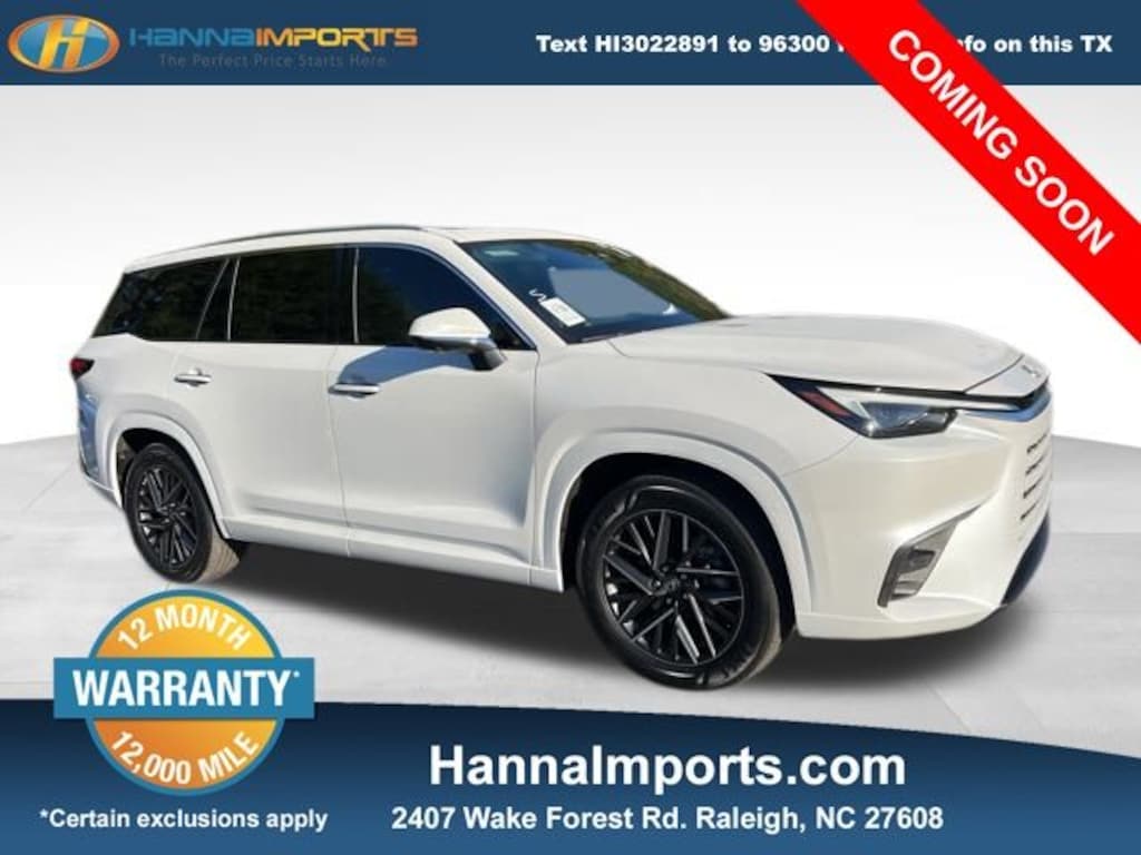 Why shop with Hanna Imports? We specialize in hand-selecting top-quality used cars, trucks, and SUVs for drivers across Raleigh, Durham, Cary, Chapel Hill, and the greater Triangle area of North Carolina. Our massive selection of 1,000+ vehicles on our Raleigh lot is carefully curated to include the most sought-after models, all priced below market value. We believe in transparency and efficiencyâ"our vehicles are aggressively priced from the start, which means no haggling, no hassle, and no wasted time. The price you see is our absolute best price. Whether you're coming from Wake Forest, Apex, Garner, or anywhere in central NC, weâre committed to making your car-buying experience smooth, affordable, and enjoyable. Come see why Hanna Imports is one of the most trusted used car dealerships in North Carolina! Used Lexus TX in Raleigh. Used Lexus TX in North Carolina, Cold Weather Package (Leather Heated Steering Wheel w/Paddles and Wiper & Window Deicer), Convenience Package (Digital Key, Lane Keeping System, Pre-Collision System, and Rear Side Monitor), Technology Package (Intelligent Parking Assist, Peripheral Monitor Camera, and Standard Normal Speed Meter), Exterior Parking Camera Rear, Navigation system: Drive Connect Cloud Navigation (subscription required), Power Liftgate, Power moonroof, 12 Speakers, 20" Wheels, 3rd row seats: split-bench, 4-Wheel Disc Brakes, ABS brakes, Air Conditioning, Alloy wheels, AM/FM radio, Auto High-beam Headlights, Auto tilt-away steering wheel, Auto-dimming door mirrors, Auto-dimming Rear-View mirror, Automatic temperature control, Brake assist, Bumpers: body-color, Delay-off headlights, Driver door bin, Driver vanity mirror, Dual front impact airbags, Dual front side impact airbags, Electronic Stability Control, Emergency communication system: Safety Connect (10-year trial), Four wheel independent suspension, Front anti-roll bar, Front Bucket Seats, Front Center Armrest, Front dual zone A/C, Front fog lights, Front reading lights, Fully automatic headlights, Garage door transmitter: HomeLink, Heated & Air Conditioned Front Seats, Heated door mirrors, Heated front seats, Illuminated entry, Knee airbag, Leather Shift Knob, Leather steering wheel, Low tire pressure warning, Memory seat, NuLuxe Pattern Perforated Seat Trim, Occupant sensing airbag, Outside temperature display, Overhead airbag, Panic alarm, Passenger door bin, Passenger vanity mirror, Power door mirrors, Power driver seat, Power passenger seat, Power steering, Power windows, Radio data system, Radio: Lexus Interface, Rain sensing wipers, Rear air conditioning, Rear anti-roll bar, Rear reading lights, Rear seat center armrest, Rear window defroster, Rear window wiper, Reclining 3rd row seat, Remote keyless entry, Security system, Speed control, Speed-sensing steering, Split folding rear seat, Spoiler, Steering wheel memory, Steering wheel mounted audio controls, Tachometer, TBD Axle Ratio, Telescoping steering wheel, Tilt steering wheel, Traction control, Trip computer, Turn signal indicator mirrors, Variably intermittent wipers, Ventilated front seats, and Wireless Apple CarPlay/Wireless Android Auto.