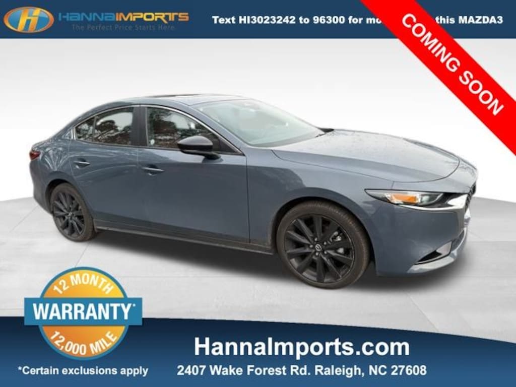 Why shop with Hanna Imports? We specialize in hand-selecting top-quality used cars, trucks, and SUVs for drivers across Raleigh, Durham, Cary, Chapel Hill, and the greater Triangle area of North Carolina. Our massive selection of 1,000+ vehicles on our Raleigh lot is carefully curated to include the most sought-after models, all priced below market value. We believe in transparency and efficiencyâ"our vehicles are aggressively priced from the start, which means no haggling, no hassle, and no wasted time. The price you see is our absolute best price. Whether you're coming from Wake Forest, Apex, Garner, or anywhere in central NC, weâre committed to making your car-buying experience smooth, affordable, and enjoyable. Come see why Hanna Imports is one of the most trusted used car dealerships in North Carolina! Used Mazda Mazda3 in Raleigh. Used Mazda Mazda3 in North Carolina, Mazda3 2.5 S Carbon Edition, AWD, Exterior Parking Camera Rear, Power moonroof, 4-Wheel Disc Brakes, 8 Speakers, ABS brakes, Air Conditioning, Alloy wheels, AM/FM radio, Auto High-beam Headlights, Automatic temperature control, Brake assist, Bumpers: body-color, Compass, Delay-off headlights, Driver door bin, Driver vanity mirror, Dual front impact airbags, Dual front side impact airbags, Electronic Stability Control, Emergency communication system: Mazda Connected Services (1-year complimentary trial included), Front anti-roll bar, Front Bucket Seats, Front Center Armrest, Front dual zone A/C, Front reading lights, Front wheel independent suspension, Fully automatic headlights, Heated door mirrors, Heated front seats, Heated Front Sport Bucket Seats, Illuminated entry, Knee airbag, Leather Seat Trim, Leather Shift Knob, Leather steering wheel, Low tire pressure warning, MAZDA CONNECT Infotainment System, Memory seat, Occupant sensing airbag, Outside temperature display, Overhead airbag, Overhead console, Panic alarm, Passenger door bin, Passenger vanity mirror, Power door mirrors, Power driver seat, Power steering, Power windows, Radio data system, Radio: AM/FM/HD Audio System, Rain sensing wipers, Rear seat center armrest, Rear side impact airbag, Rear window defroster, Remote keyless entry, Speed control, Speed-sensing steering, Split folding rear seat, Steering wheel mounted audio controls, Tachometer, Telescoping steering wheel, Tilt steering wheel, Traction control, Trip computer, Turn signal indicator mirrors, Variably intermittent wipers, and Wheels: 18" x 7J Aluminum Alloy.