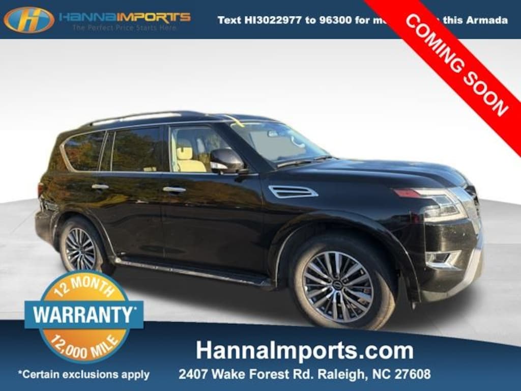 Why shop with Hanna Imports? We specialize in hand-selecting top-quality used cars, trucks, and SUVs for drivers across Raleigh, Durham, Cary, Chapel Hill, and the greater Triangle area of North Carolina. Our massive selection of 1,000+ vehicles on our Raleigh lot is carefully curated to include the most sought-after models, all priced below market value. We believe in transparency and efficiencyâ"our vehicles are aggressively priced from the start, which means no haggling, no hassle, and no wasted time. The price you see is our absolute best price. Whether you're coming from Wake Forest, Apex, Garner, or anywhere in central NC, weâre committed to making your car-buying experience smooth, affordable, and enjoyable. Come see why Hanna Imports is one of the most trusted used car dealerships in North Carolina! Used Nissan Armada in Raleigh. Used Nissan Armada in North Carolina, Armada SL, Exterior Parking Camera Rear, Navigation System, Power Liftgate, Power moonroof, Remote keyless entry, 13 Speakers, 2.94 Axle Ratio, 3rd Row Carpeted Floor Mats - Bench Seat, 3rd row seats: split-bench, 4-Wheel Disc Brakes, 6-Speaker Audio System, ABS brakes, Air Conditioning, Alloy wheels, AM/FM radio: SiriusXM, Anti-whiplash front head restraints, Auto High-beam Headlights, Auto tilt-away steering wheel, Auto-dimming door mirrors, Auto-dimming Rear-View mirror, Auto-leveling suspension, Automatic temperature control, Bose 13-Speaker Premium Audio System, Brake assist, Bumpers: body-color, Delay-off headlights, Driver door bin, Driver vanity mirror, Dual front impact airbags, Dual front side impact airbags, Electronic Stability Control, Emergency communication system: NissanConnect Services, Four wheel independent suspension, Front anti-roll bar, Front Bucket Seats, Front Center Armrest, Front dual zone A/C, Front fog lights, Front reading lights, Fully automatic headlights, Garage door transmitter: HomeLink, Heated door mirrors, Heated Front Bucket Seats, Heated front seats, Heated steering wheel, Illuminated entry, Knee airbag, Leather Shift Knob, Leather-Appointed Seat Trim, Low tire pressure warning, Memory seat, NissanConnect featuring Apple CarPlay and Android Auto, Occupant sensing airbag, Outside temperature display, Overhead airbag, Overhead console, Panic alarm, Passenger door bin, Passenger vanity mirror, Power door mirrors, Power driver seat, Power passenger seat, Power steering, Power windows, Premium audio system: Bose, Radio: NissanConnect w/SiriusXM, Rear air conditioning, Rear anti-roll bar, Rear reading lights, Rear seat center armrest, Rear window defroster, Rear window wiper, Reclining 3rd row seat, Security system, Speed control, Speed-sensing steering, Speed-Sensitive Wipers, Split folding rear seat, Spoiler, Steering wheel memory, Steering wheel mounted audio controls, Tachometer, Telescoping steering wheel, Tilt steering wheel, Traction control, Trip computer, Turn signal indicator mirrors, Variably intermittent wipers, Voltmeter, and Wheels: 20" x 8J Painted Alloy.